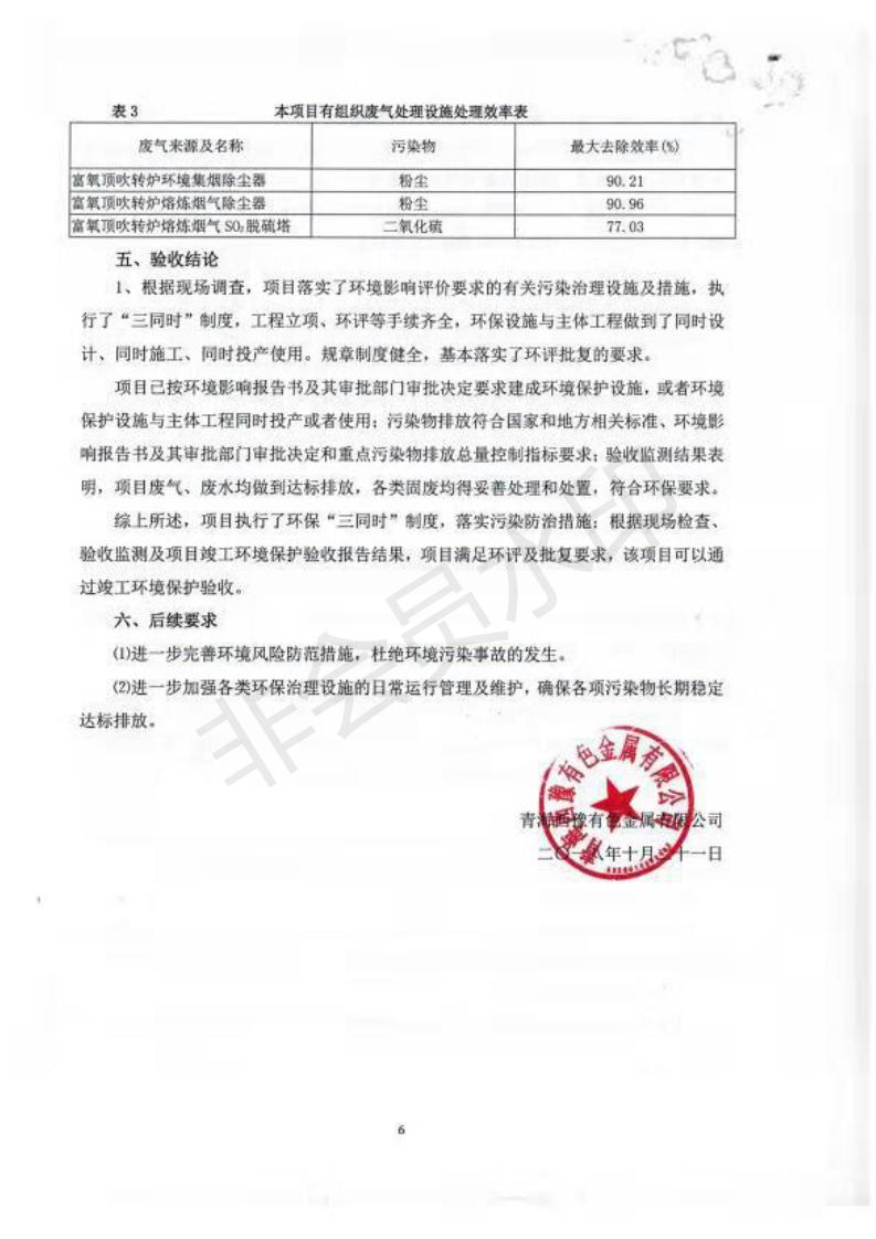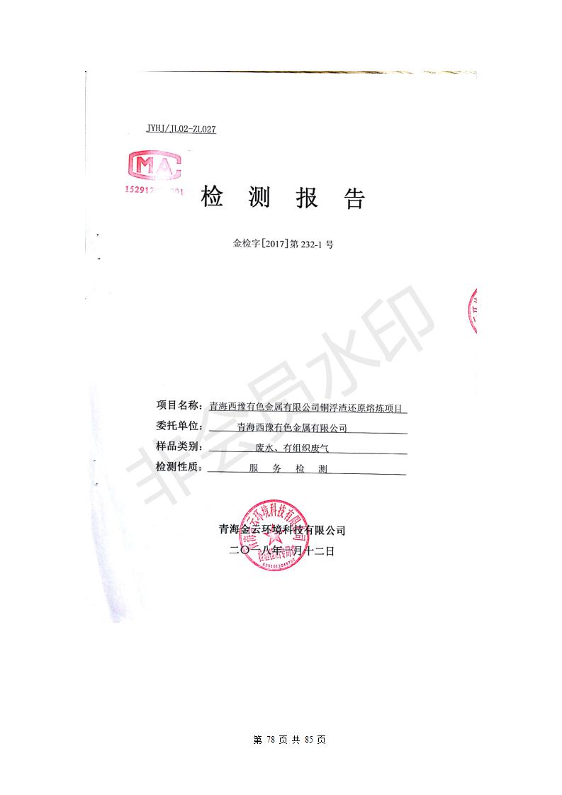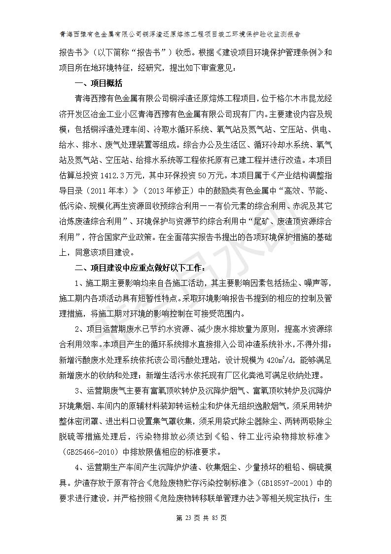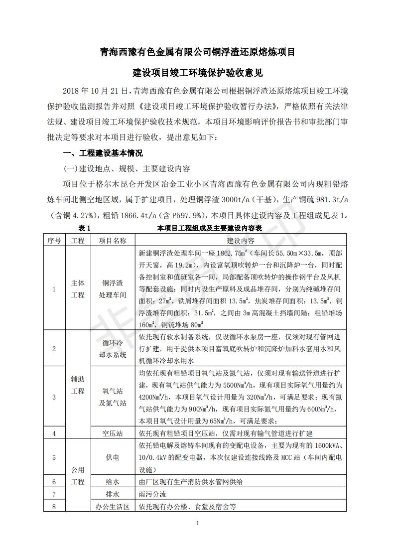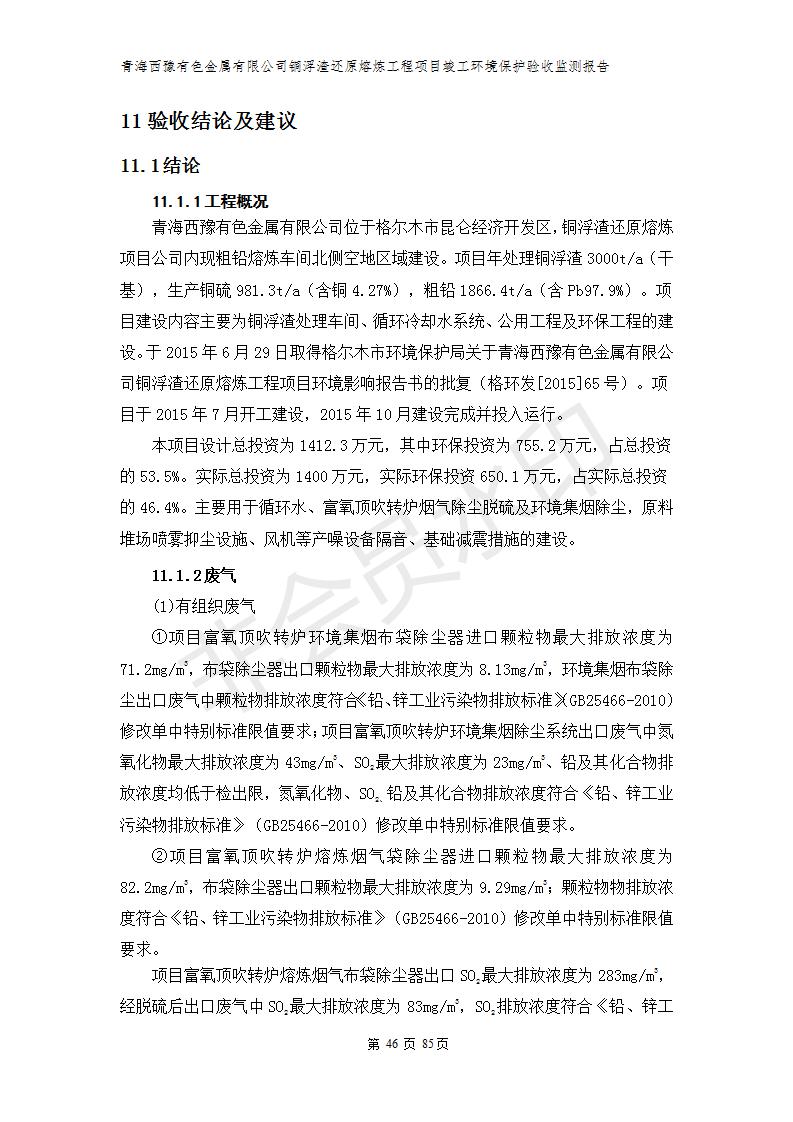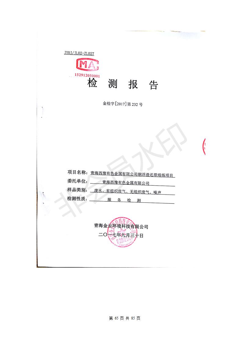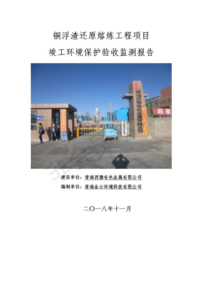 青海西豫有色金屬有限公司銅浮渣還原熔煉工程項目竣工環(huán)境保護驗收監(jiān)測報告公示發(fā)布日期:(2018-11-23) 點擊次數(shù):2629 |