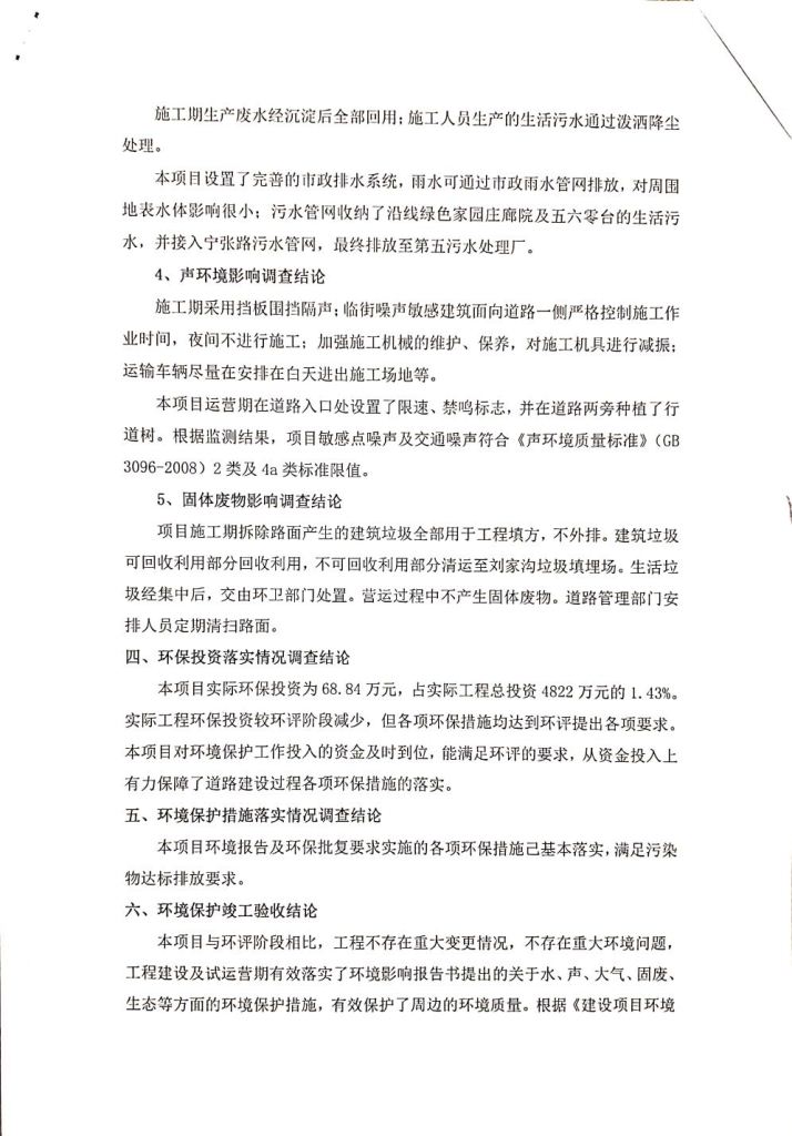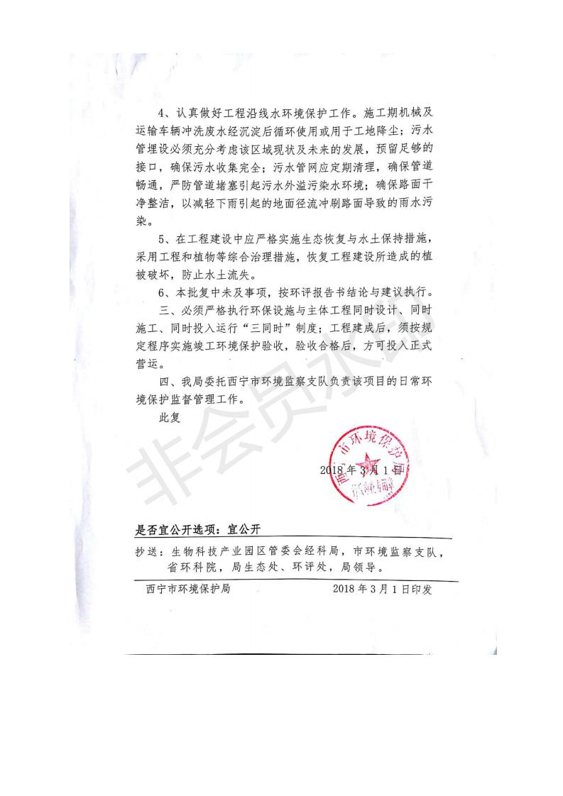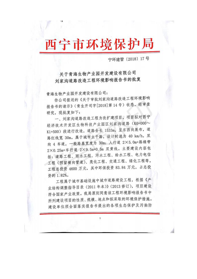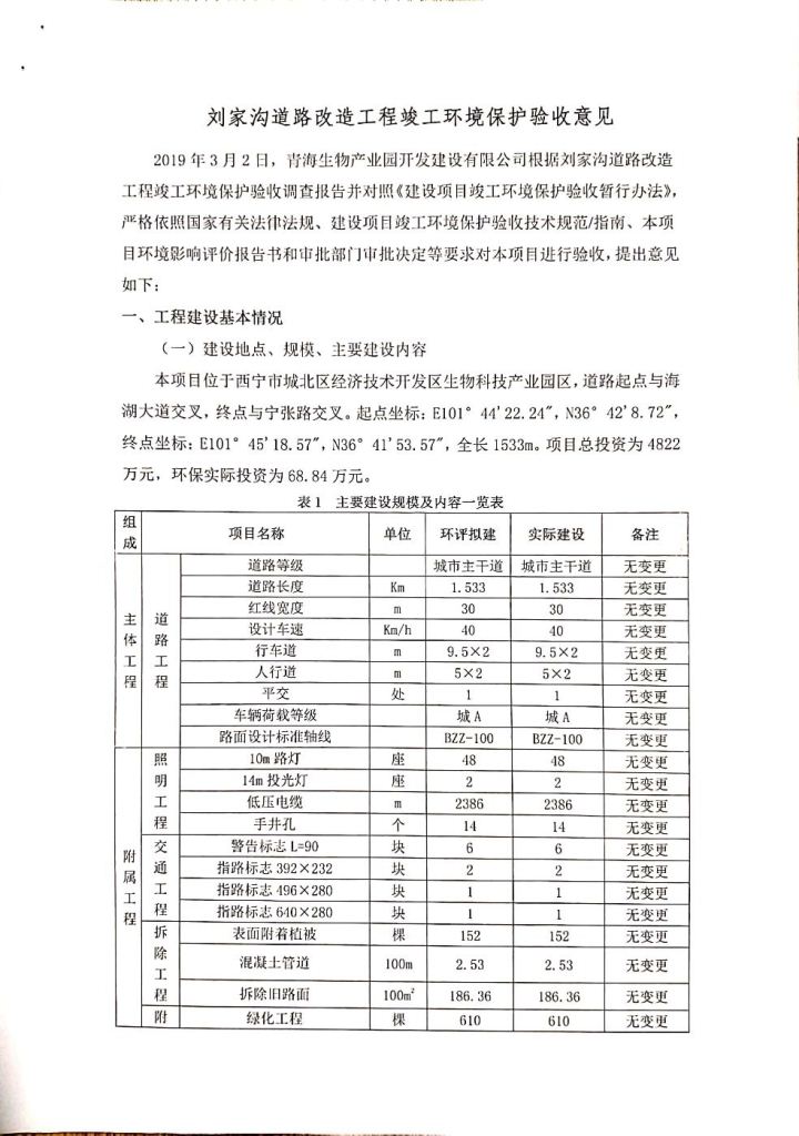 根據(jù)中華人民共和國(guó)務(wù)院令第682號(hào)《國(guó)務(wù)院關(guān)于修改〈建設(shè)項(xiàng)目環(huán)境保護(hù)管理?xiàng)l例〉的決定》和《建設(shè)項(xiàng)目竣工環(huán)境保護(hù)驗(yàn)收暫行辦法》(國(guó)務(wù)院令682號(hào)),劉家溝道路改造工程竣工環(huán)境保護(hù)驗(yàn)收內(nèi)容(包括竣工環(huán)境保護(hù)驗(yàn)收調(diào)查報(bào)告和驗(yàn)收意見(jiàn))公示如下: 一、項(xiàng)目名稱:劉家溝道路改造工程 二、地點(diǎn):青海省西寧市城北區(qū)生物園區(qū) 三、建設(shè)單位:生物產(chǎn)業(yè)園開(kāi)發(fā)建設(shè)有限公司 四、建設(shè)內(nèi)容:劉家溝道路經(jīng)改造后全長(zhǎng)1533m,道路呈東西向展布,道路紅線為30m。設(shè)計(jì)時(shí)速為40km/h,雙向4車道。 五、公示時(shí)間:二〇一九年三月十四日至二〇一九年四月十一日 六、聯(lián)系人:張工 公示期間,對(duì)上述公示內(nèi)容如有異議,請(qǐng)以書(shū)面形式反饋,個(gè)人須署真實(shí)姓名,單位須加蓋公章。