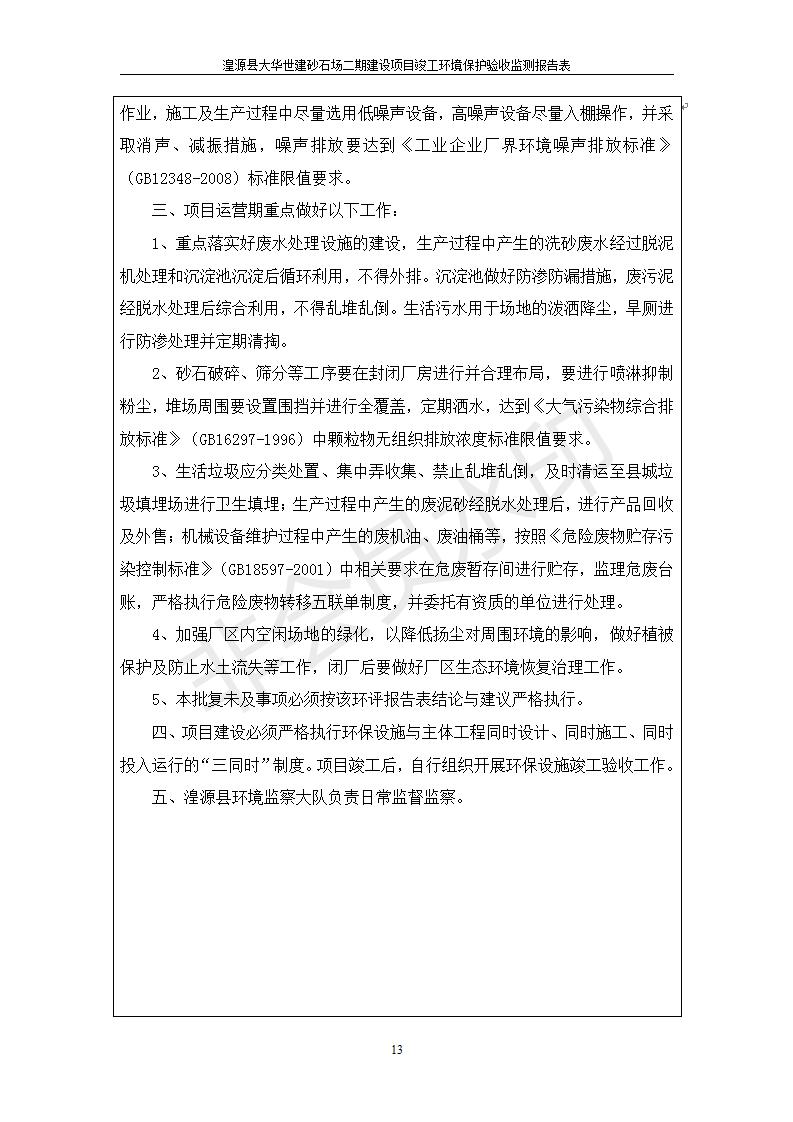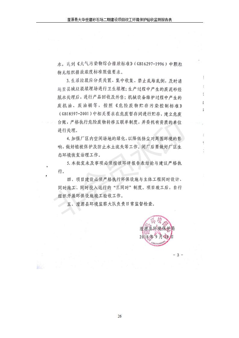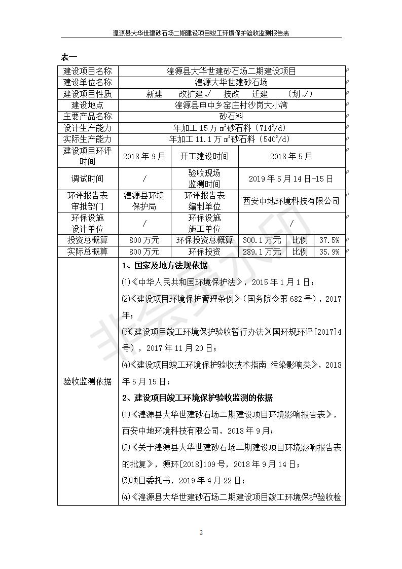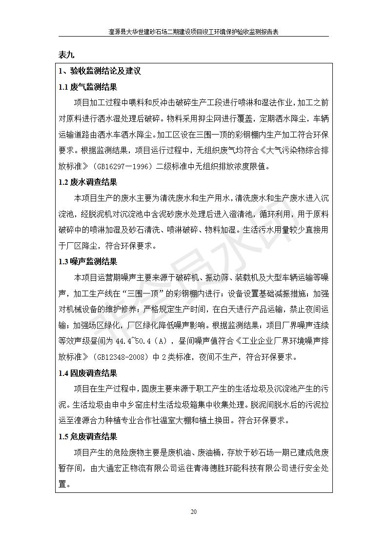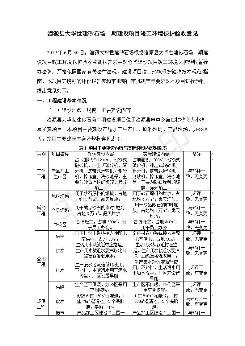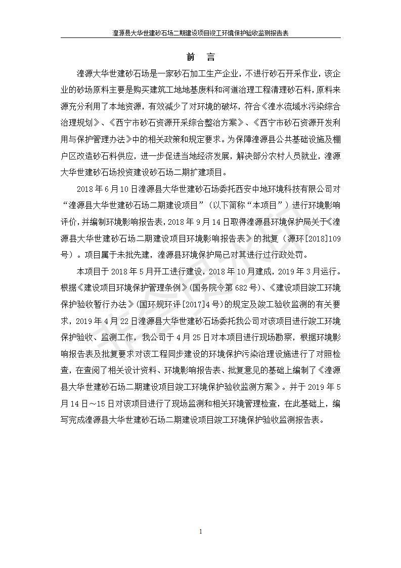 根據(jù)中華人民共和國國務(wù)院令第682號《國務(wù)院關(guān)于修改〈建設(shè)項目環(huán)境保護(hù)管理條例〉的決定》和《建設(shè)項目竣工環(huán)境保護(hù)驗收暫行辦法》(國務(wù)院令682號),湟源大華世建砂石場湟源縣大華世建砂石場二期建設(shè)項目(包括竣工環(huán)境保護(hù)驗收監(jiān)測報告表和驗收意見)公示如下。 一、項目名稱:湟源縣大華世建砂石場二期建設(shè)項目 二、地點(diǎn):湟源縣申中鄉(xiāng)窯莊村沙崗大小灣 三、建設(shè)單位:湟源大華世建砂石場 四、建設(shè)內(nèi)容:項目主要建設(shè)砂石料產(chǎn)品加工生產(chǎn)區(qū)、原料堆場、產(chǎn)品堆場、辦公區(qū)等。五、聯(lián)系人:張工 六、聯(lián)系電 話:0971-6515411 七、公示時間:二〇一九年七月二十五日至二〇一九年八月二十一日公示期間,對上述公示內(nèi)容如有異議,請以書面形式反饋,個人須署真實姓名,單位須加蓋公章。