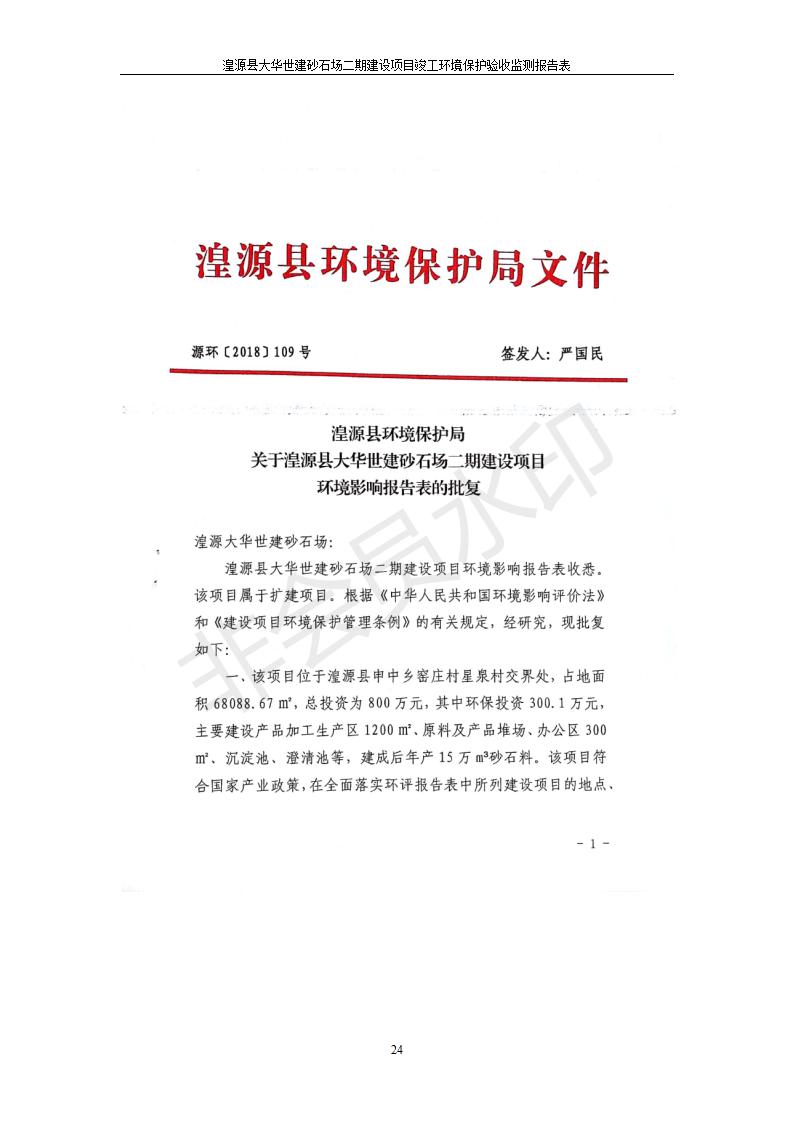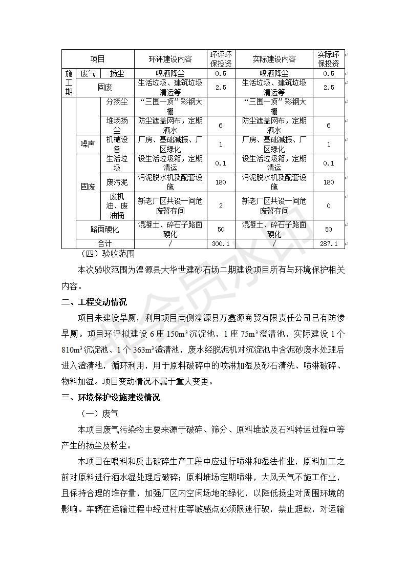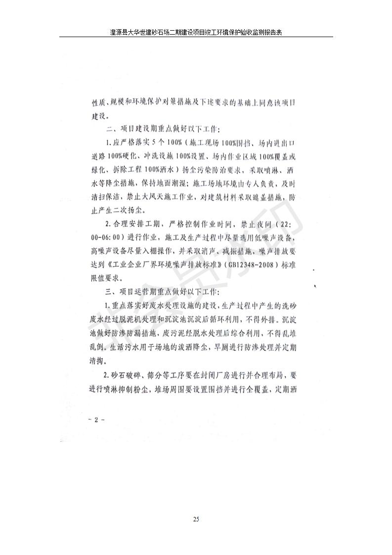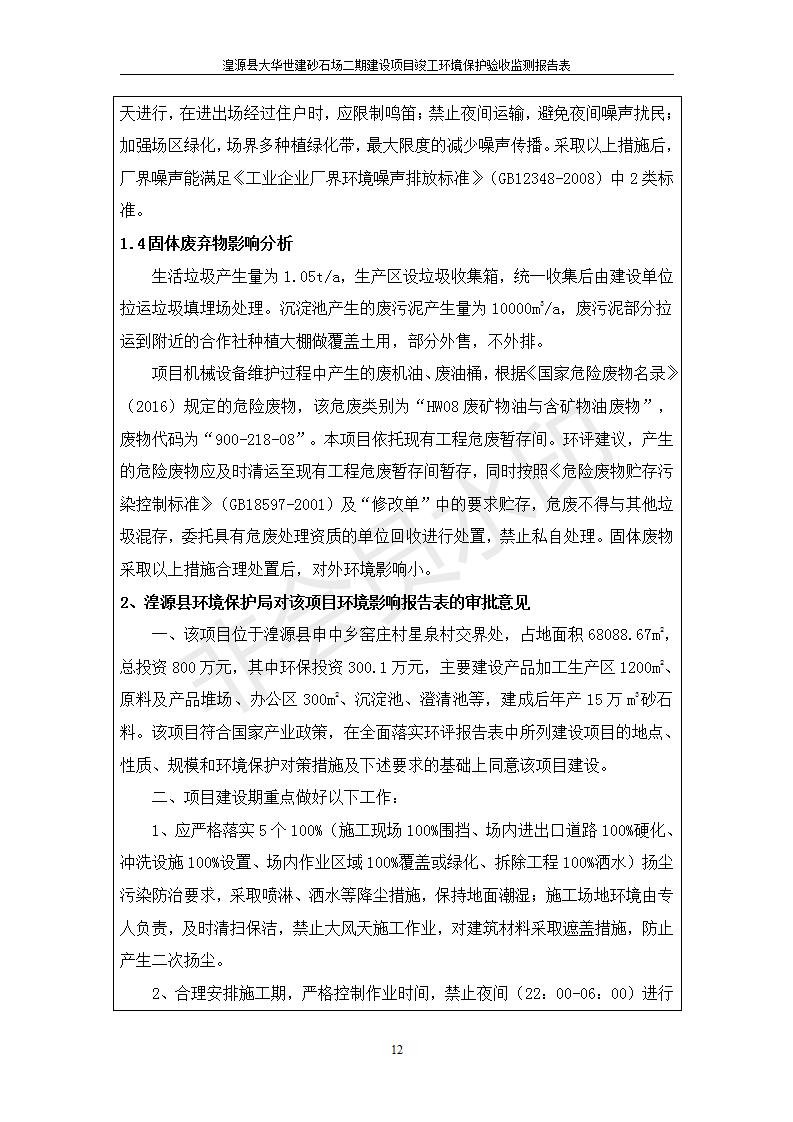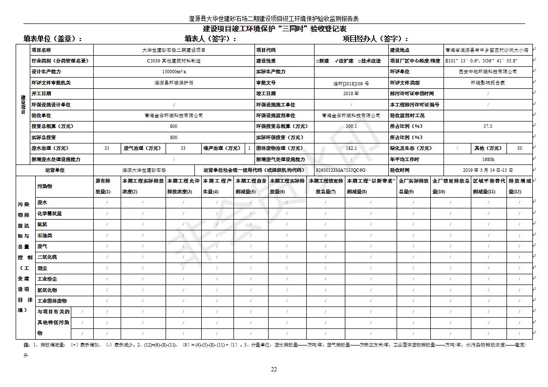 根據(jù)中華人民共和國國務(wù)院令第682號《國務(wù)院關(guān)于修改〈建設(shè)項目環(huán)境保護(hù)管理條例〉的決定》和《建設(shè)項目竣工環(huán)境保護(hù)驗收暫行辦法》(國務(wù)院令682號),湟源大華世建砂石場湟源縣大華世建砂石場二期建設(shè)項目(包括竣工環(huán)境保護(hù)驗收監(jiān)測報告表和驗收意見)公示如下。 一、項目名稱:湟源縣大華世建砂石場二期建設(shè)項目 二、地點(diǎn):湟源縣申中鄉(xiāng)窯莊村沙崗大小灣 三、建設(shè)單位:湟源大華世建砂石場 四、建設(shè)內(nèi)容:項目主要建設(shè)砂石料產(chǎn)品加工生產(chǎn)區(qū)、原料堆場、產(chǎn)品堆場、辦公區(qū)等。五、聯(lián)系人:張工 六、聯(lián)系電 話:0971-6515411 七、公示時間:二〇一九年七月二十五日至二〇一九年八月二十一日公示期間,對上述公示內(nèi)容如有異議,請以書面形式反饋,個人須署真實姓名,單位須加蓋公章。