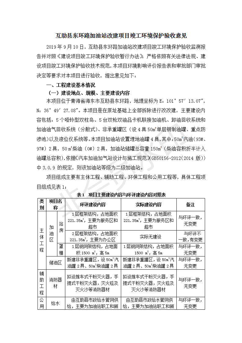 根據(jù)中華人民共和國國務(wù)院令第682號《國務(wù)院關(guān)于修改〈建設(shè)項目環(huán)境保護管理條例〉的決定》和《建設(shè)項目竣工環(huán)境保護驗收暫行辦法》(國務(wù)院令682號),互助縣東環(huán)路加油站改建項目(包括竣工環(huán)境保護驗收監(jiān)測報告表和驗收意見)公示如下。 一、項目名稱:互助縣東環(huán)路加油站改建項目 二、地點:青海省海東市互助縣東環(huán)路 六、聯(lián)系電話:0971-6515411 七、公示時間:二〇一九年九月二十七日至二〇一九年十月二十九日 公示期間,對上述公示內(nèi)容如有異議,請以書面形式反饋,個人須署真實姓名,單位須加蓋公章。