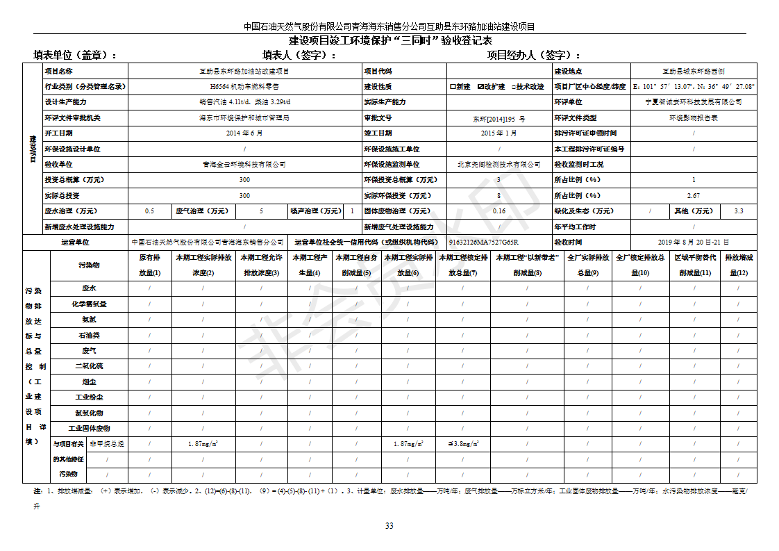 | 上一篇:互助縣東和加油站原址擴建項目 竣工環(huán)境保護驗收監(jiān)測報告表公示 | 下一篇:互助縣沙塘川加油站建設(shè)項目竣工環(huán)境保護驗收監(jiān)測報告表 |