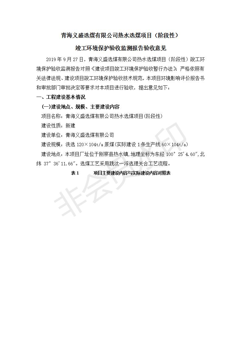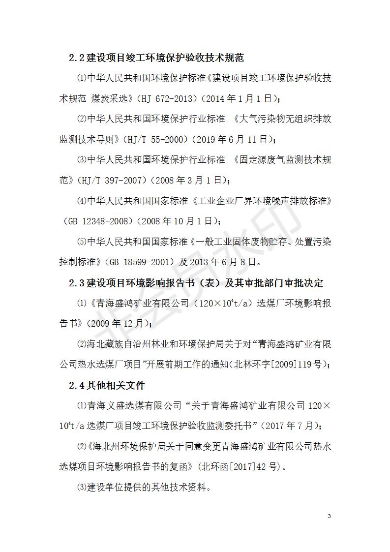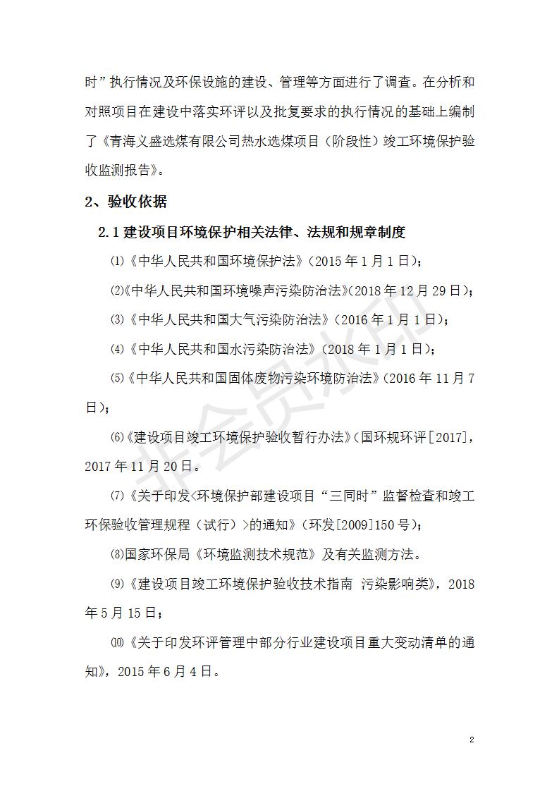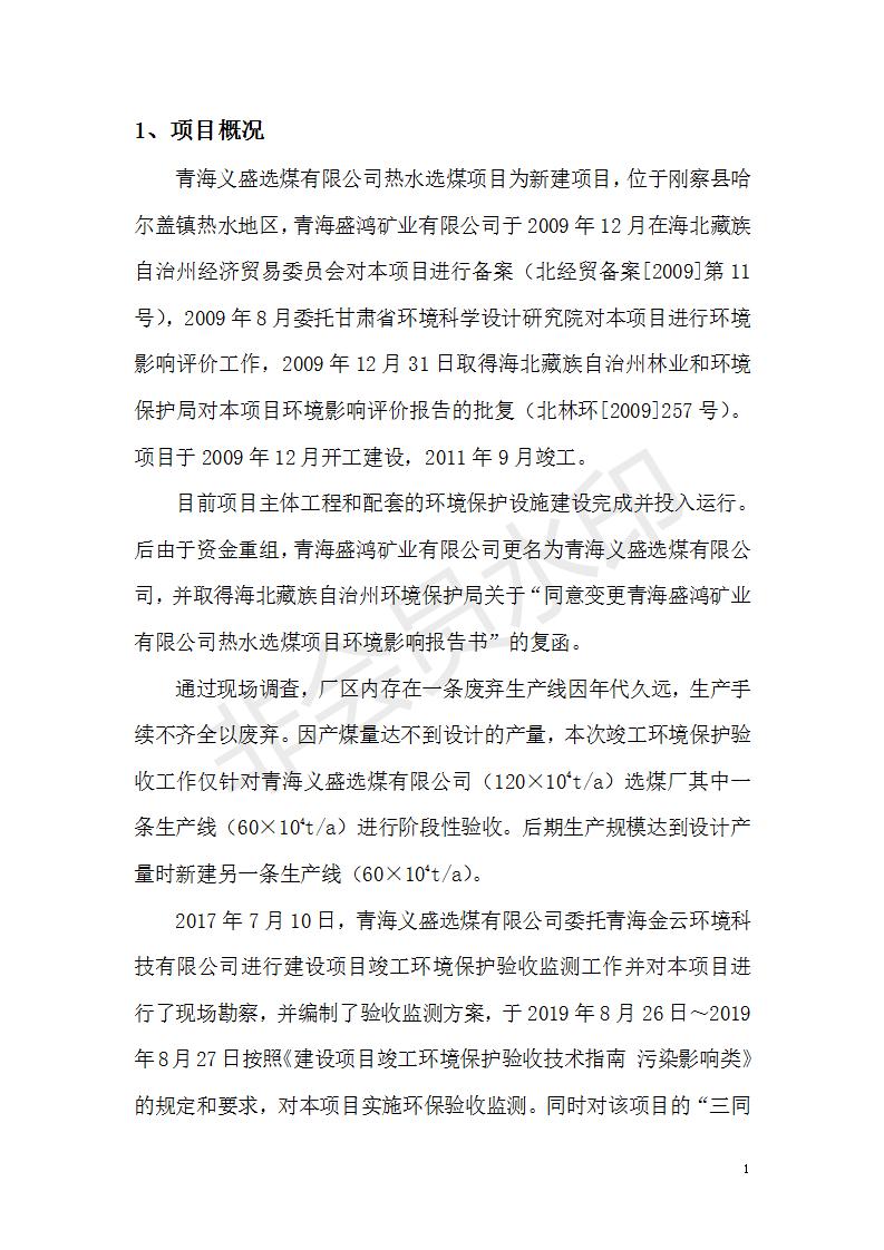 根據(jù)中華人民共和國(guó)國(guó)務(wù)院令第682號(hào)《國(guó)務(wù)院關(guān)于修改〈建設(shè)項(xiàng)目環(huán)境保護(hù)管理?xiàng)l例〉的決定》和《建設(shè)項(xiàng)目竣工環(huán)境保護(hù)驗(yàn)收暫行辦法》(國(guó)務(wù)院令682號(hào)),青海義盛選煤有限公司熱水選煤項(xiàng)目(階段性)竣工環(huán)境保護(hù)驗(yàn)收監(jiān)測(cè)報(bào)告(包括竣工環(huán)境保護(hù)驗(yàn)收監(jiān)測(cè)報(bào)告和驗(yàn)收意見(jiàn))公示如下。 一、項(xiàng)目名稱(chēng):青海義盛選煤有限公司熱水選煤項(xiàng)目(階段性) 二、地點(diǎn):剛察縣熱水鎮(zhèn) 此外還包括公用工程系統(tǒng)、消防系統(tǒng)及輔助生產(chǎn)設(shè)施等。 五、聯(lián)系人:張工六、聯(lián)系電話:0971-6515411 七、公示時(shí)間:二〇一九年十一月十二日至二〇一九年十二月九日