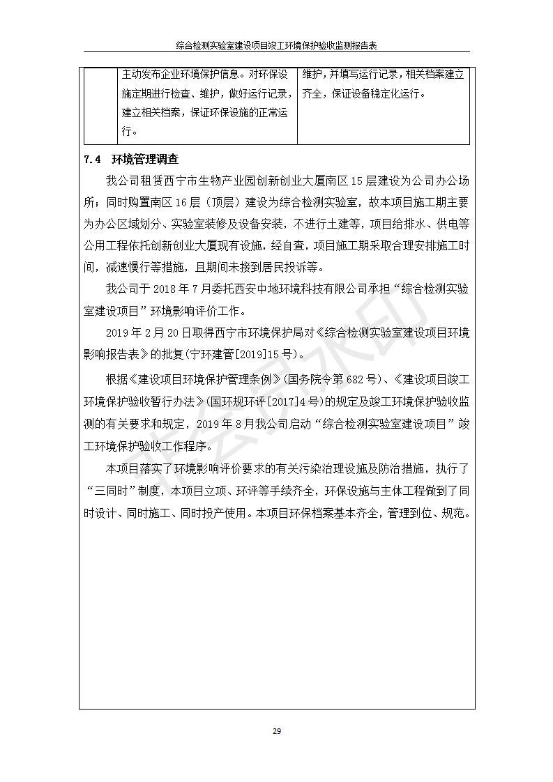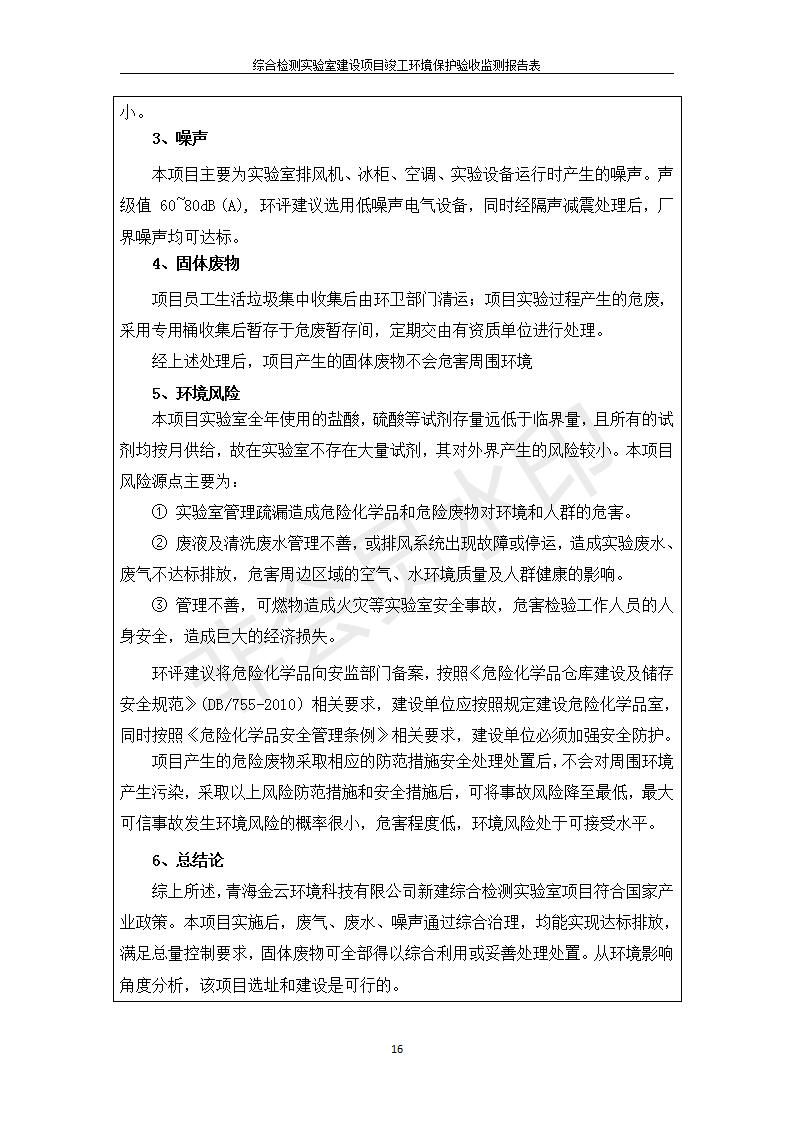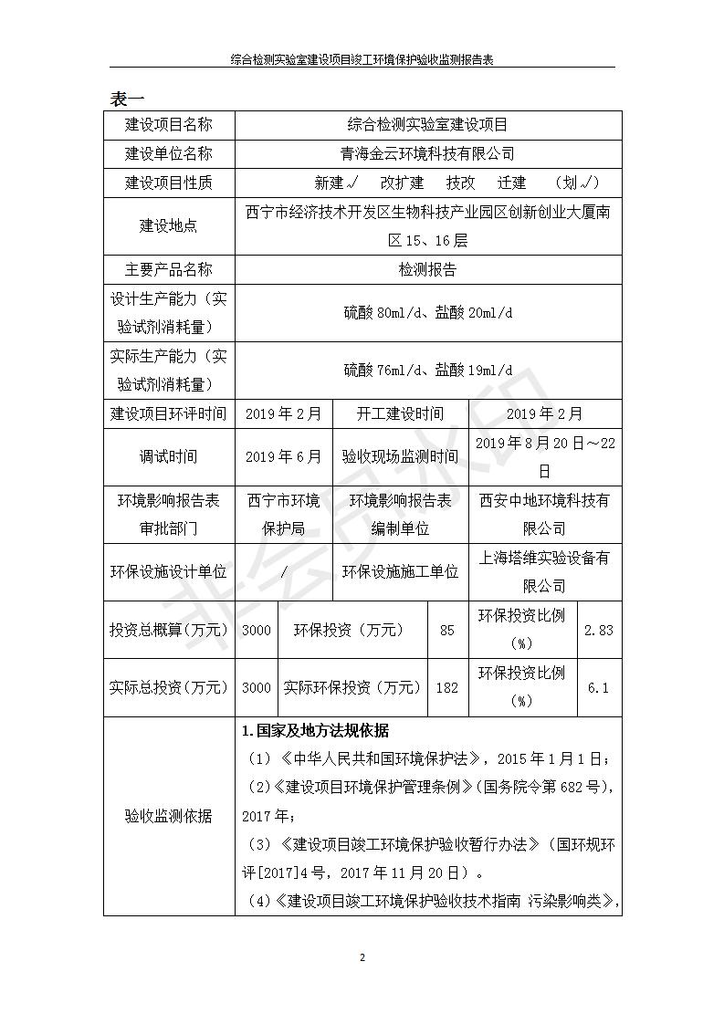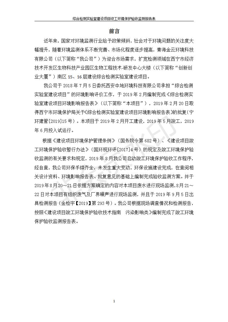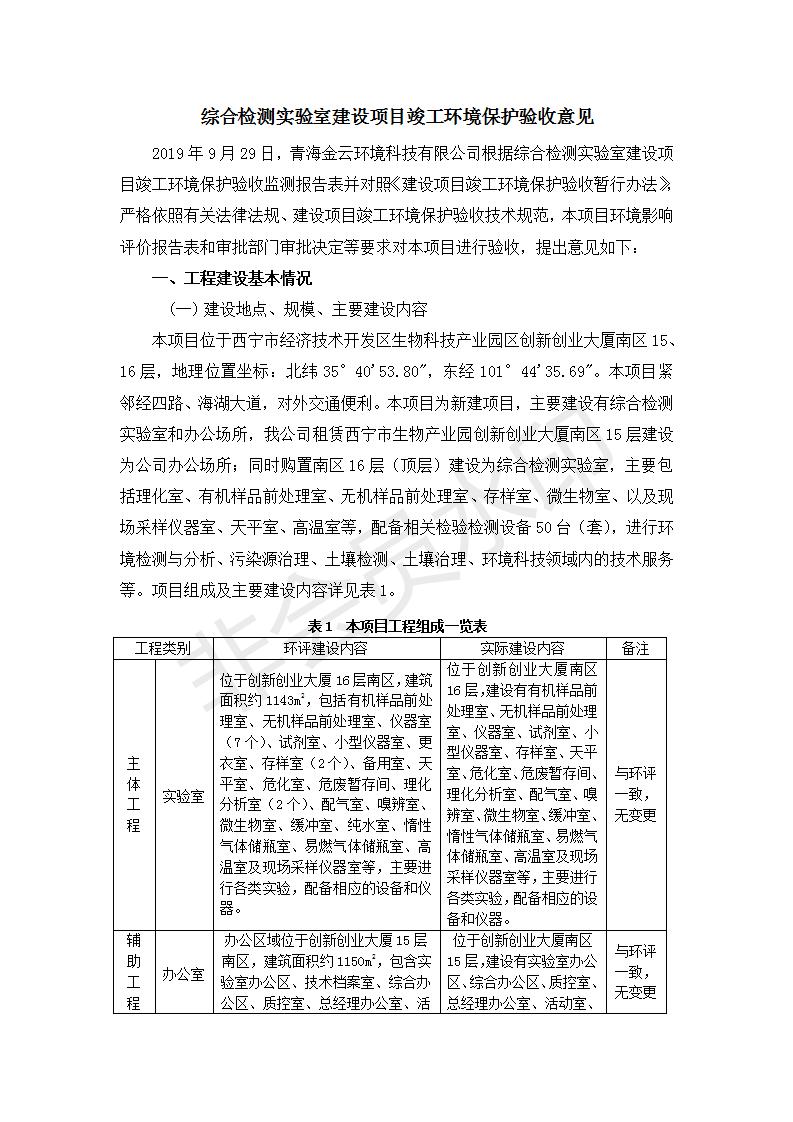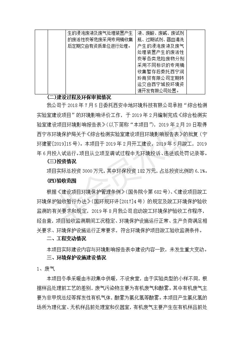 根據(jù)中華人民共和國國務(wù)院令第682號《國務(wù)院關(guān)于修改〈建設(shè)項(xiàng)目環(huán)境保護(hù)管理?xiàng)l例〉的決定》和《建設(shè)項(xiàng)目竣工環(huán)境保護(hù)驗(yàn)收暫行辦法》(國務(wù)院令682號),綜合檢測實(shí)驗(yàn)室建設(shè)項(xiàng)目(包括竣工環(huán)境保護(hù)驗(yàn)收監(jiān)測報(bào)告表和驗(yàn)收意見)公示如下。 一、項(xiàng)目名稱:綜合檢測實(shí)驗(yàn)室建設(shè)項(xiàng)目 二、地點(diǎn):西寧市經(jīng)濟(jì)技術(shù)開發(fā)區(qū)生物科技產(chǎn)業(yè)園區(qū)創(chuàng)新創(chuàng)業(yè)大廈南區(qū)15、16層 六、聯(lián)系電話:0971-6515411 七、公示時(shí)間:二〇一九年十一月十九日至二〇一九年十二月十六日 公示期間,對上述公示內(nèi)容如有異議,請以書面形式反饋,個(gè)人須署真實(shí)姓名,單位須加蓋公章。