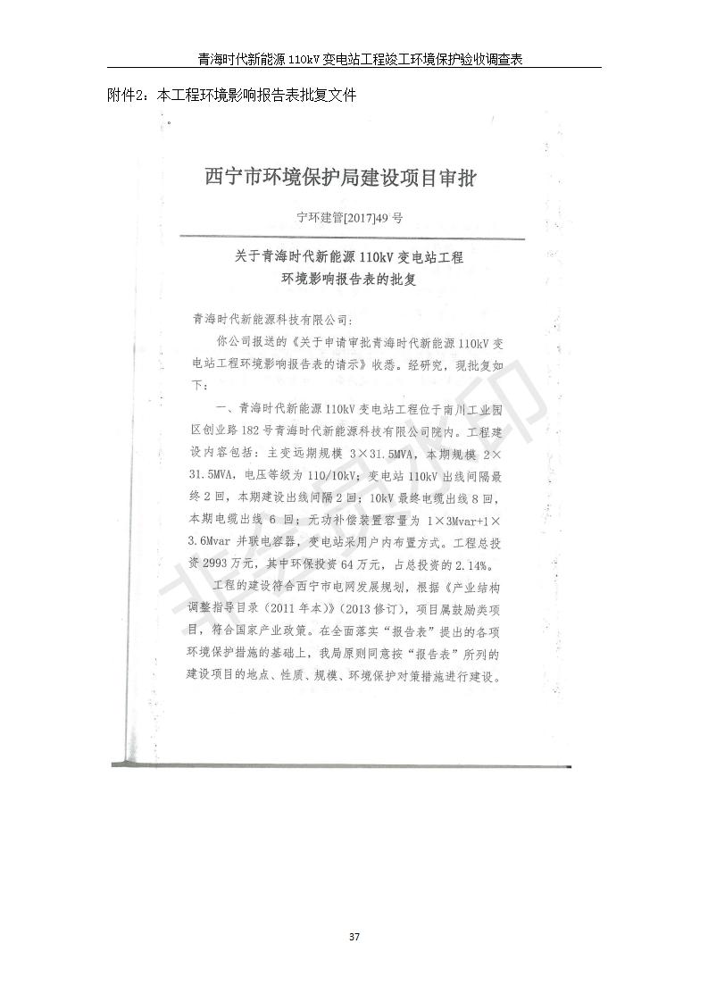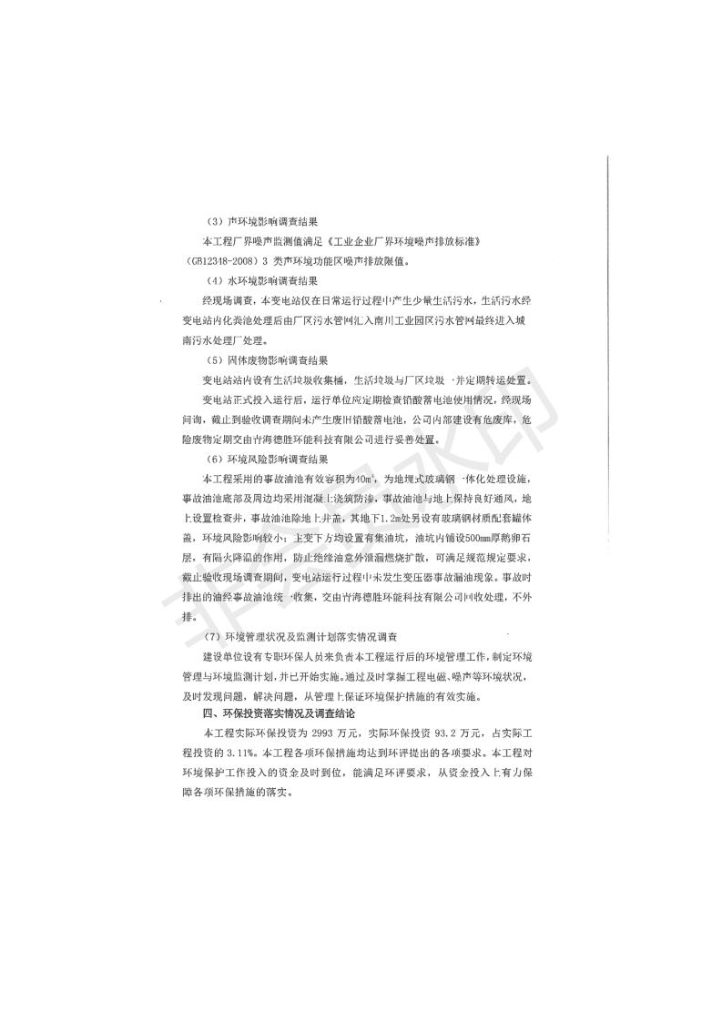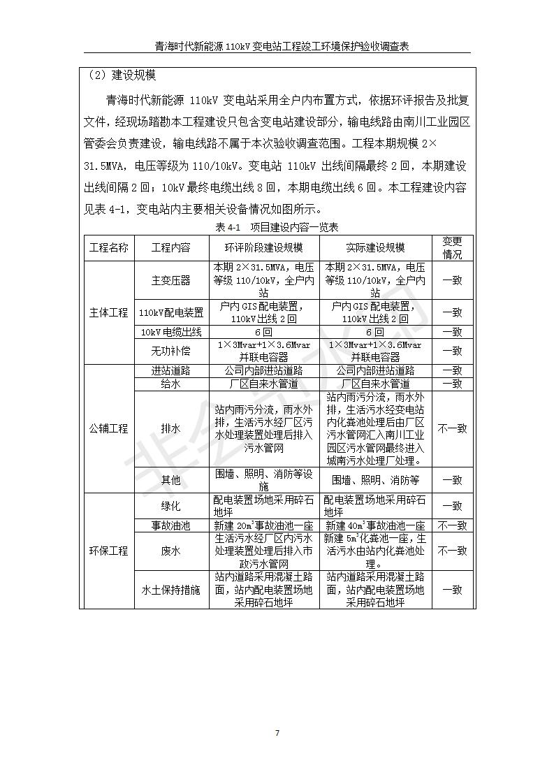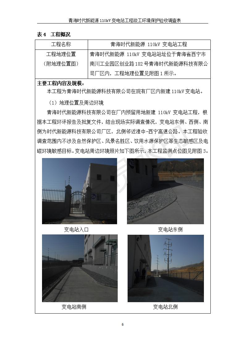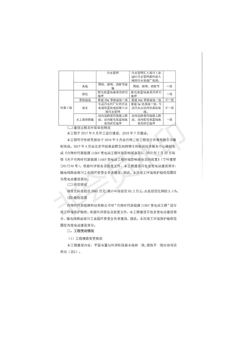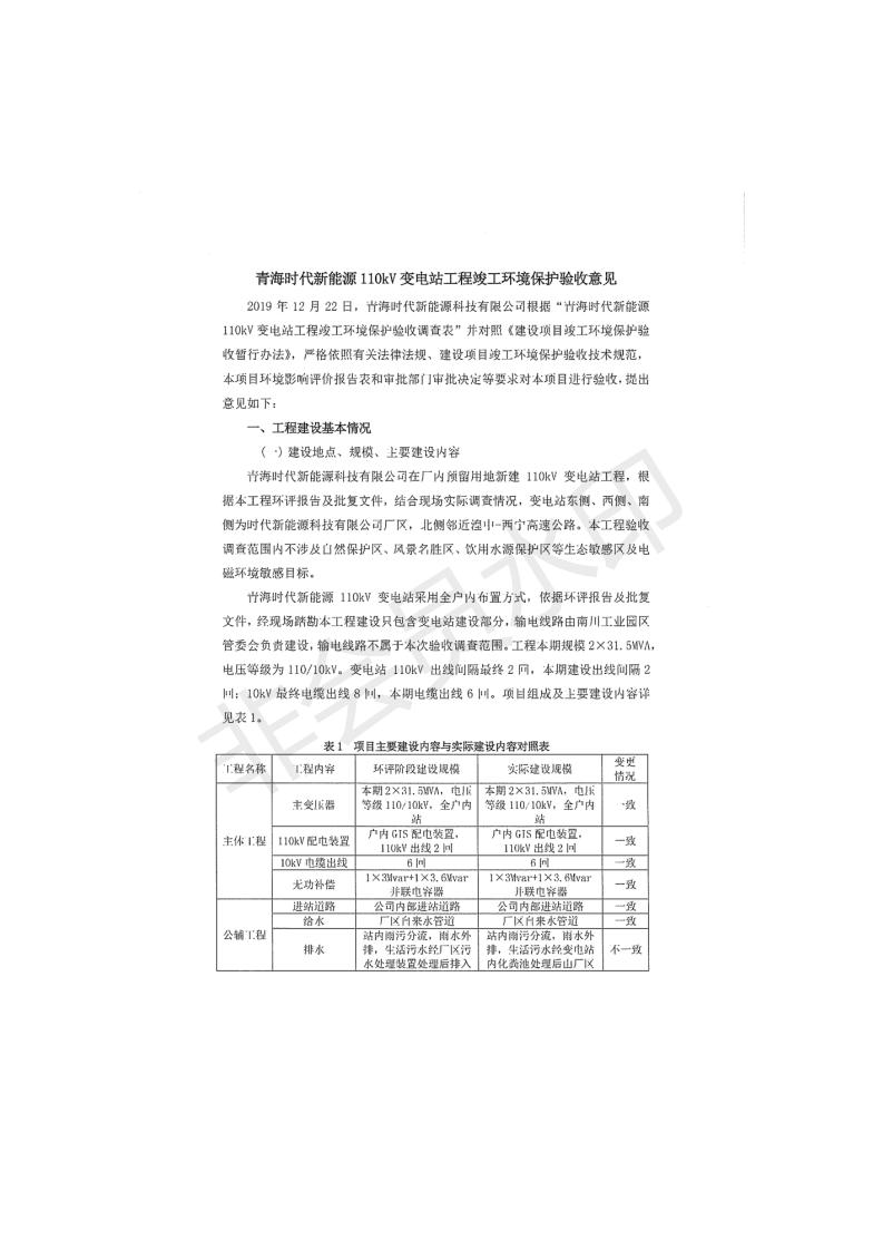 根據(jù)中華人民共和國國務(wù)院令第682號《國務(wù)院關(guān)于修改〈建設(shè)項(xiàng)目環(huán)境保護(hù)管理?xiàng)l例〉的決定》和《建設(shè)項(xiàng)目竣工環(huán)境保護(hù)驗(yàn)收暫行辦法》(國務(wù)院令682號),青海時(shí)代新能源110kV變電站工程(包括竣工環(huán)境保護(hù)驗(yàn)收調(diào)查表和驗(yàn)收意見)公示如下。 一、項(xiàng)目名稱:青海時(shí)代新能源110kV變電站工程 二、地點(diǎn):青海省西寧市南川工業(yè)園區(qū)創(chuàng)業(yè)路182號青海時(shí)代新能源科技有限公司廠區(qū)內(nèi) 三、建設(shè)單位:青海時(shí)代新能源科技有限公司 四、建設(shè)內(nèi)容:青海時(shí)代新能源 110kV 變電站采用全戶內(nèi)布置方式,依據(jù)環(huán)評報(bào)告及批復(fù)文件,經(jīng)現(xiàn)場踏勘本工程建設(shè)只包含變電站建設(shè)部分,輸電線路由南川工業(yè)園區(qū)管委會(huì)負(fù)責(zé)建設(shè),輸電線路不屬于本次驗(yàn)收調(diào)查范圍。工程本期規(guī)模2×31.5MVA,電壓等級為110/10kV。變電站 110kV 出線間隔最終2回,本期建設(shè)出線間隔2回;10kV最終電纜出線8回,本期電纜出線6回。 五、聯(lián)系人:張工 六、聯(lián)系電話:0971-6515411 七、公示時(shí)間:二〇二〇年一月十四日至二〇二〇年二月十三日 公示期間,對上述公示內(nèi)容如有異議,請以書面形式反饋,個(gè)人須署真實(shí)姓名,單位須加蓋公章。