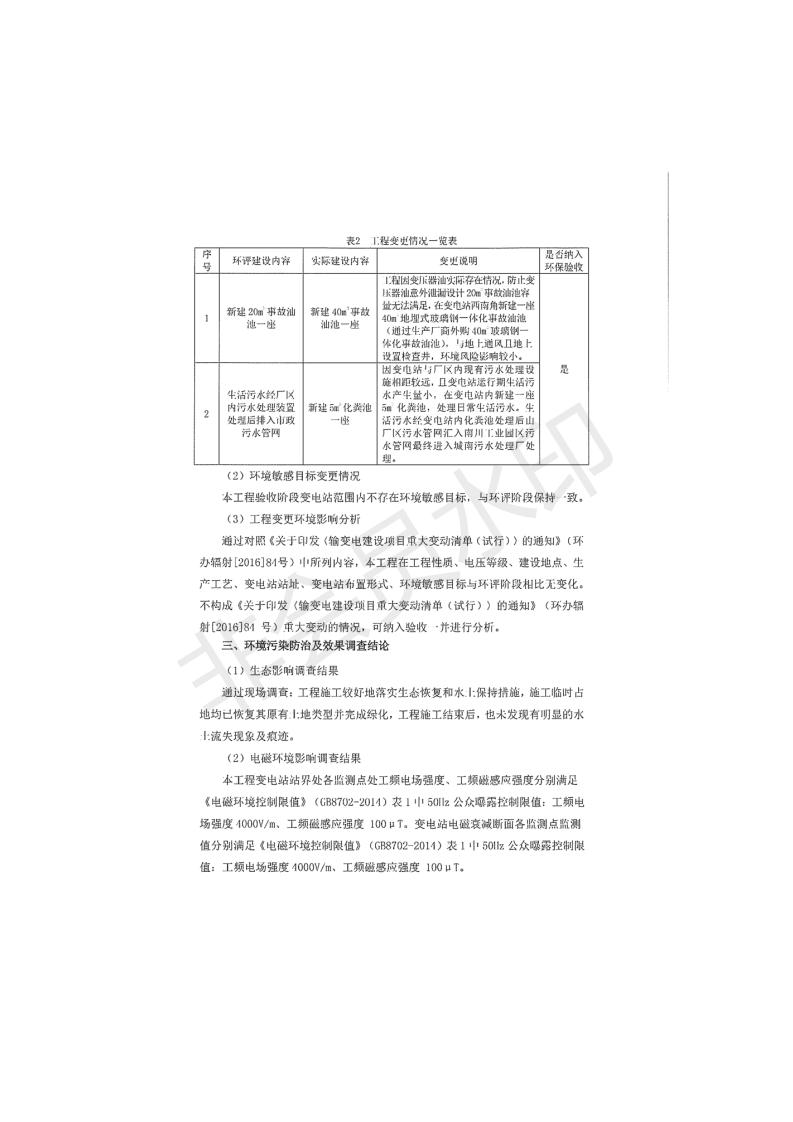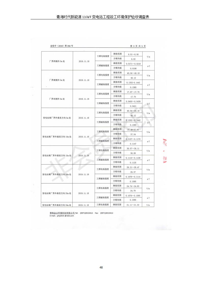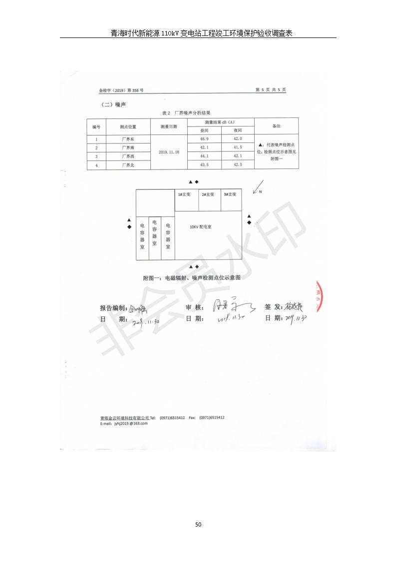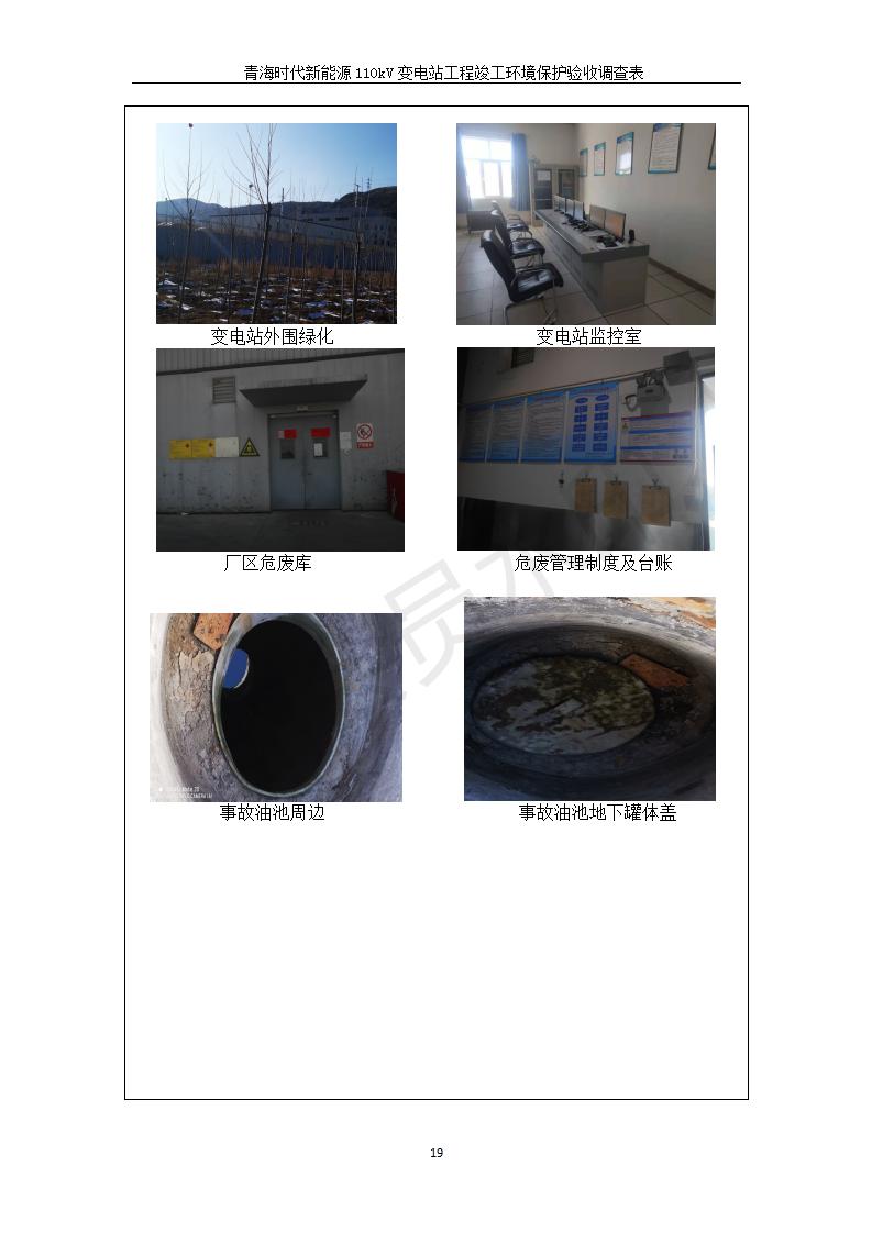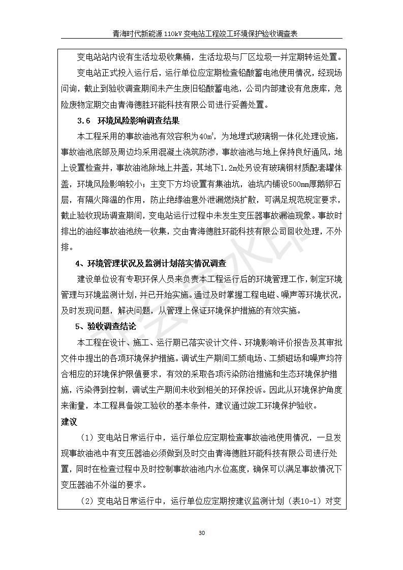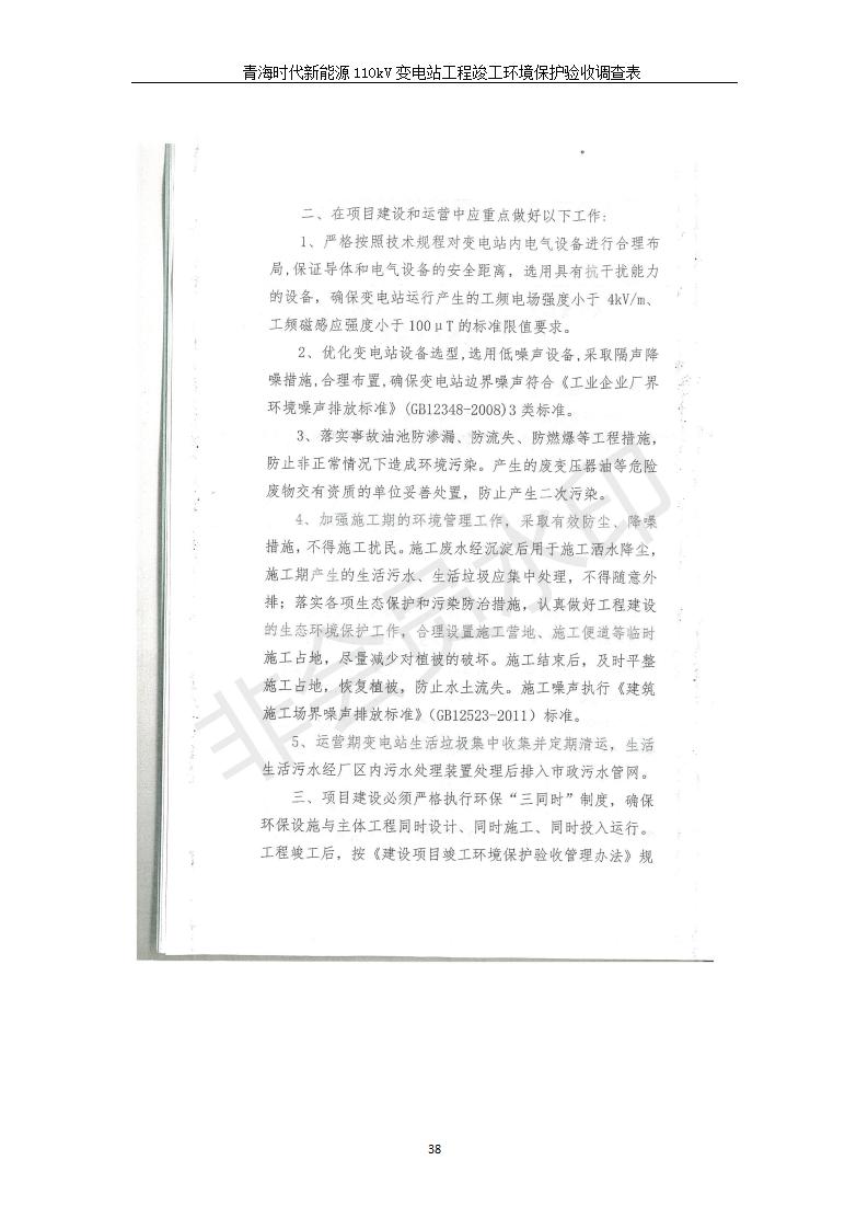 根據(jù)中華人民共和國國務(wù)院令第682號《國務(wù)院關(guān)于修改〈建設(shè)項(xiàng)目環(huán)境保護(hù)管理?xiàng)l例〉的決定》和《建設(shè)項(xiàng)目竣工環(huán)境保護(hù)驗(yàn)收暫行辦法》(國務(wù)院令682號),青海時(shí)代新能源110kV變電站工程(包括竣工環(huán)境保護(hù)驗(yàn)收調(diào)查表和驗(yàn)收意見)公示如下。 一、項(xiàng)目名稱:青海時(shí)代新能源110kV變電站工程 二、地點(diǎn):青海省西寧市南川工業(yè)園區(qū)創(chuàng)業(yè)路182號青海時(shí)代新能源科技有限公司廠區(qū)內(nèi) 三、建設(shè)單位:青海時(shí)代新能源科技有限公司 四、建設(shè)內(nèi)容:青海時(shí)代新能源 110kV 變電站采用全戶內(nèi)布置方式,依據(jù)環(huán)評報(bào)告及批復(fù)文件,經(jīng)現(xiàn)場踏勘本工程建設(shè)只包含變電站建設(shè)部分,輸電線路由南川工業(yè)園區(qū)管委會(huì)負(fù)責(zé)建設(shè),輸電線路不屬于本次驗(yàn)收調(diào)查范圍。工程本期規(guī)模2×31.5MVA,電壓等級為110/10kV。變電站 110kV 出線間隔最終2回,本期建設(shè)出線間隔2回;10kV最終電纜出線8回,本期電纜出線6回。 五、聯(lián)系人:張工 六、聯(lián)系電話:0971-6515411 七、公示時(shí)間:二〇二〇年一月十四日至二〇二〇年二月十三日 公示期間,對上述公示內(nèi)容如有異議,請以書面形式反饋,個(gè)人須署真實(shí)姓名,單位須加蓋公章。