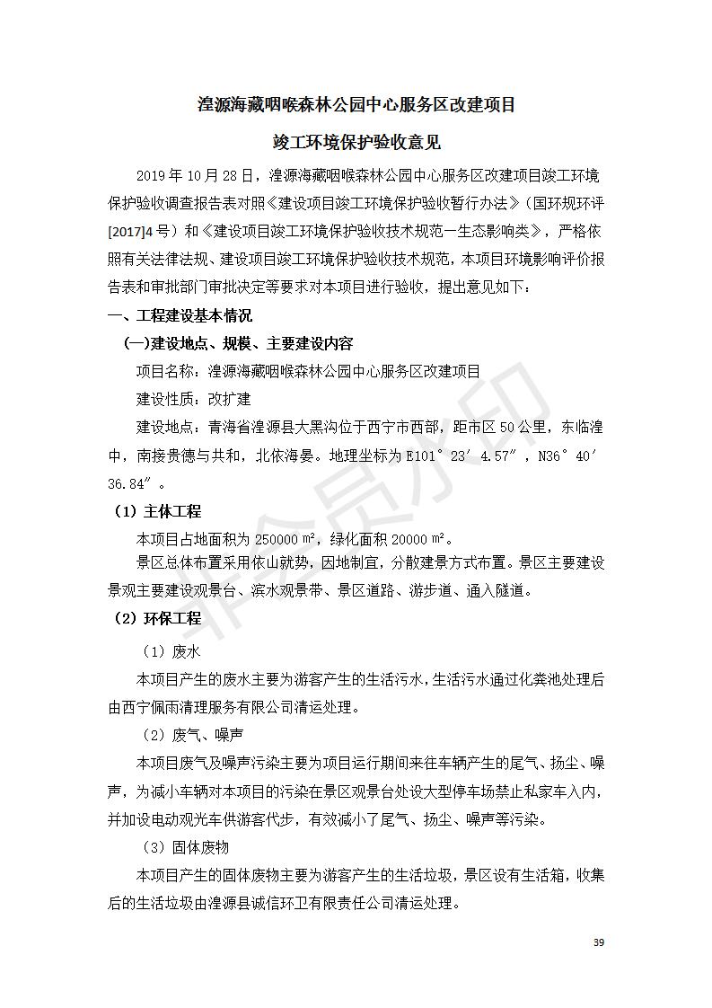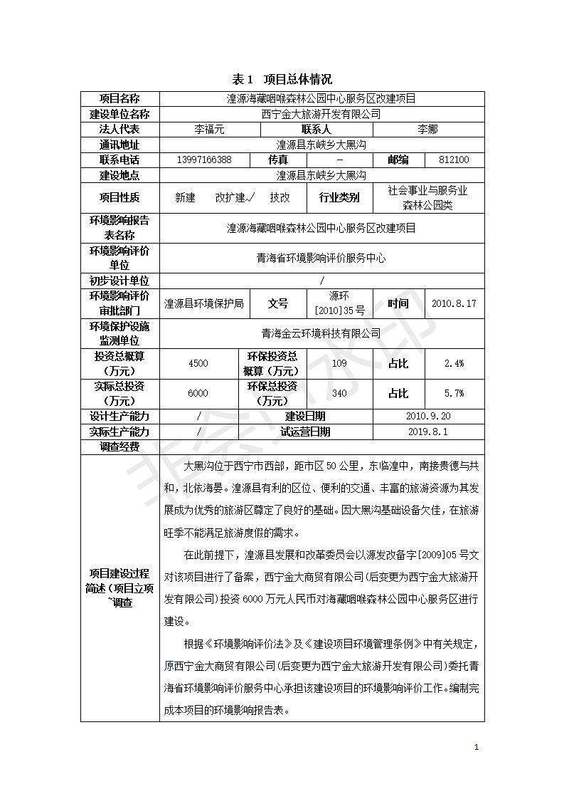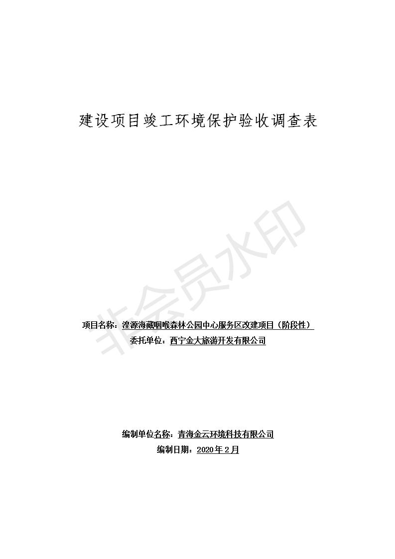 根據(jù)中華人民共和國國務(wù)院令第682號(hào)《國務(wù)院關(guān)于修改〈建設(shè)項(xiàng)目環(huán)境保護(hù)管理?xiàng)l例〉的決定》和《建設(shè)項(xiàng)目竣工環(huán)境保護(hù)驗(yàn)收暫行辦法》(國務(wù)院令682號(hào)),湟源海藏咽喉森林公園中心服務(wù)區(qū)改建項(xiàng)目(階段性),(包括竣工環(huán)境保護(hù)驗(yàn)收調(diào)查表和驗(yàn)收意見)公示如下。 一、項(xiàng)目名稱:湟源海藏咽喉森林公園中心服務(wù)區(qū)改建項(xiàng)目(階段性) 竣工環(huán)境保護(hù)驗(yàn)收調(diào)查表 二、地點(diǎn):青海省湟源縣東峽鄉(xiāng)大黑溝 三、建設(shè)單位:西寧金大旅游開發(fā)有限公司 四、建設(shè)內(nèi)容:本次階段性驗(yàn)收以自然景觀為主,建設(shè)內(nèi)容為濱水景觀帶、觀景臺(tái)、景區(qū)道路及基礎(chǔ)設(shè)施。項(xiàng)目范圍從景區(qū)大門至中心位置,全長4800m。 五、聯(lián)系人:張工 六、聯(lián)系電 話:0971-6515411 七、公示時(shí)間:二〇二〇年四月二十九日至二〇二〇年五月二十八日 公示期間,對(duì)上述公示內(nèi)容如有異議,請(qǐng)以書面形式反饋,個(gè)人須署真實(shí)姓名,單位須加蓋公章。