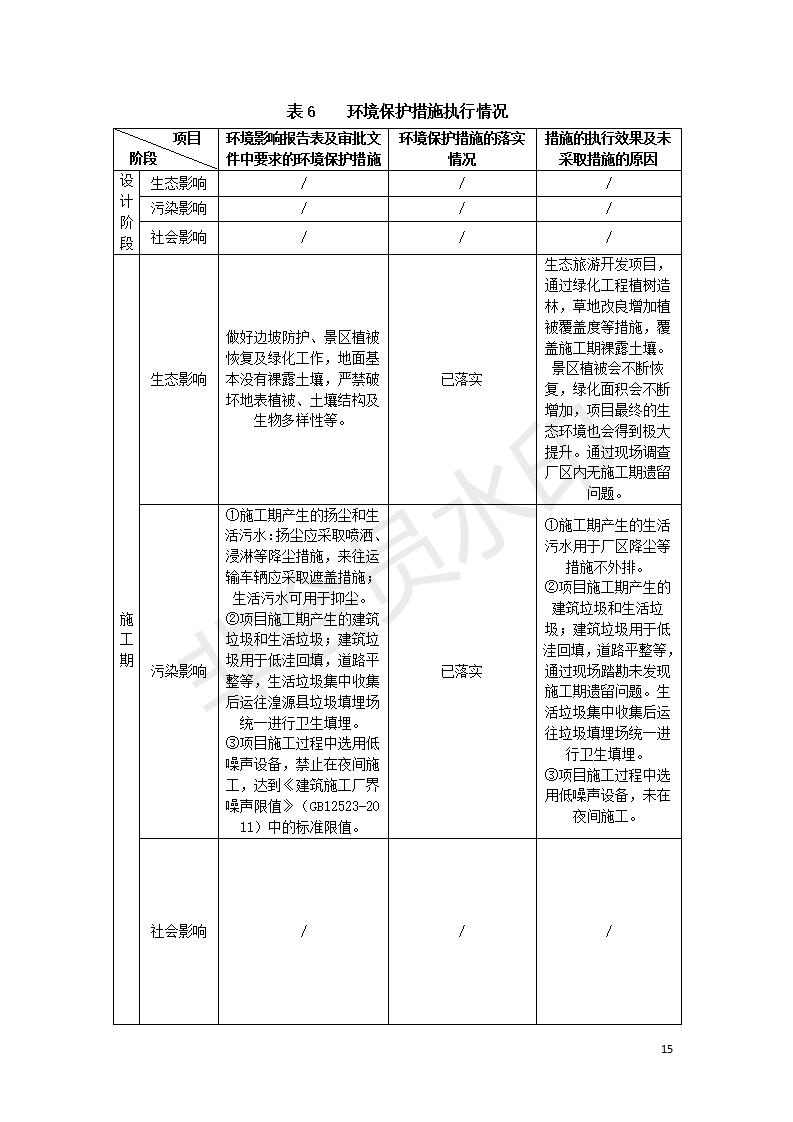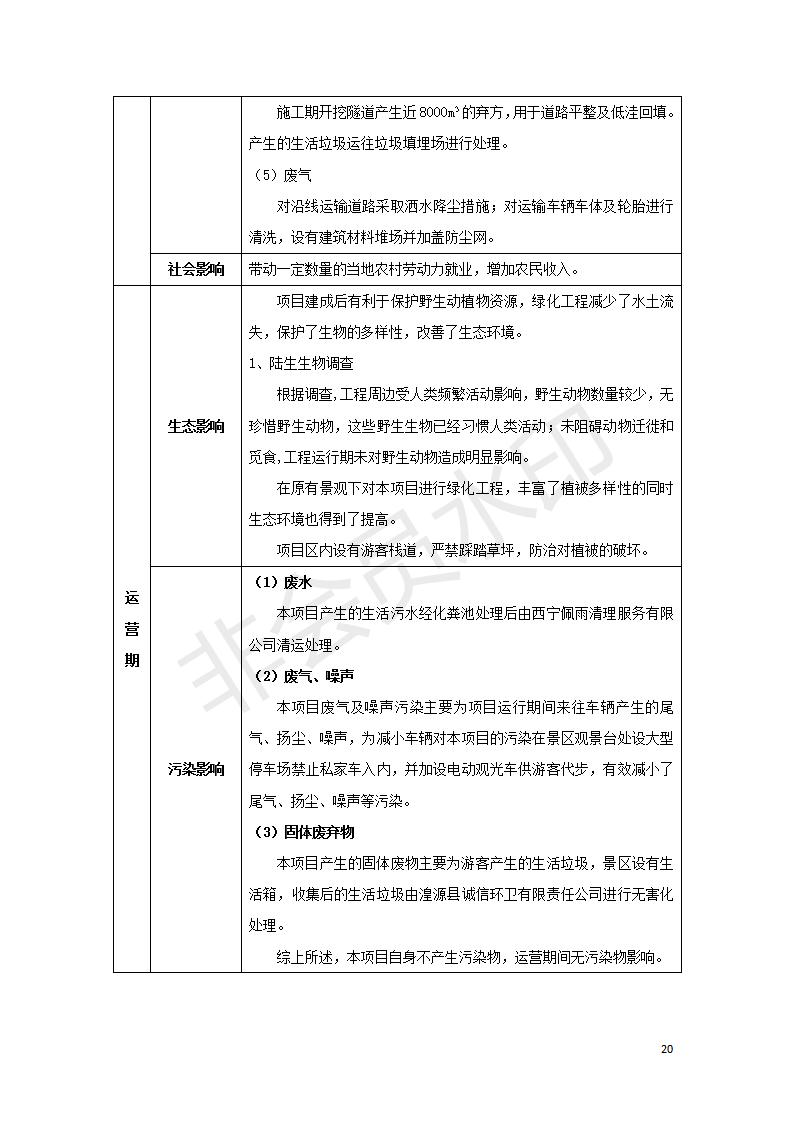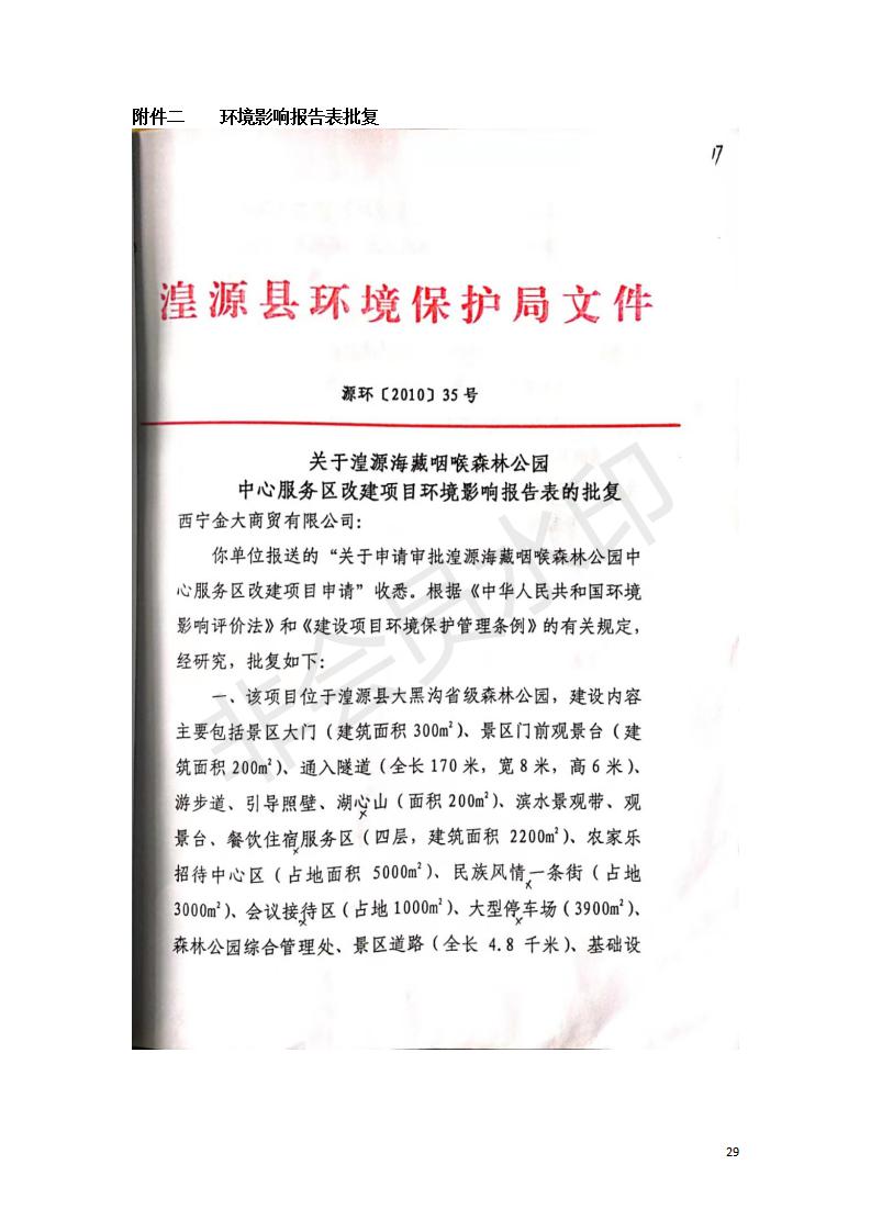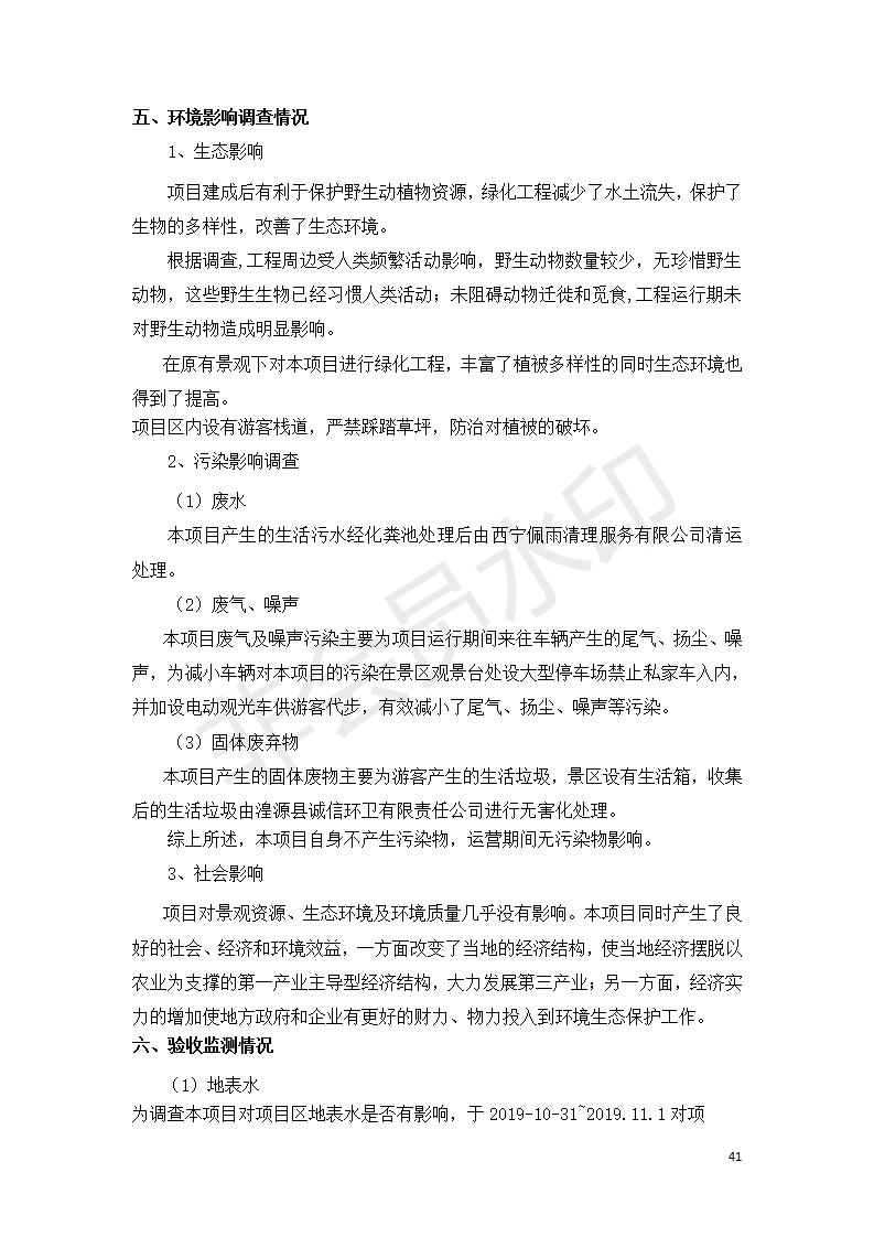 根據(jù)中華人民共和國國務(wù)院令第682號(hào)《國務(wù)院關(guān)于修改〈建設(shè)項(xiàng)目環(huán)境保護(hù)管理?xiàng)l例〉的決定》和《建設(shè)項(xiàng)目竣工環(huán)境保護(hù)驗(yàn)收暫行辦法》(國務(wù)院令682號(hào)),湟源海藏咽喉森林公園中心服務(wù)區(qū)改建項(xiàng)目(階段性),(包括竣工環(huán)境保護(hù)驗(yàn)收調(diào)查表和驗(yàn)收意見)公示如下。 一、項(xiàng)目名稱:湟源海藏咽喉森林公園中心服務(wù)區(qū)改建項(xiàng)目(階段性) 竣工環(huán)境保護(hù)驗(yàn)收調(diào)查表 二、地點(diǎn):青海省湟源縣東峽鄉(xiāng)大黑溝 三、建設(shè)單位:西寧金大旅游開發(fā)有限公司 四、建設(shè)內(nèi)容:本次階段性驗(yàn)收以自然景觀為主,建設(shè)內(nèi)容為濱水景觀帶、觀景臺(tái)、景區(qū)道路及基礎(chǔ)設(shè)施。項(xiàng)目范圍從景區(qū)大門至中心位置,全長4800m。 五、聯(lián)系人:張工 六、聯(lián)系電 話:0971-6515411 七、公示時(shí)間:二〇二〇年四月二十九日至二〇二〇年五月二十八日 公示期間,對(duì)上述公示內(nèi)容如有異議,請(qǐng)以書面形式反饋,個(gè)人須署真實(shí)姓名,單位須加蓋公章。