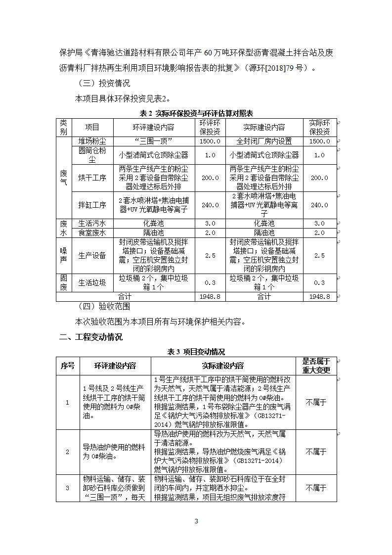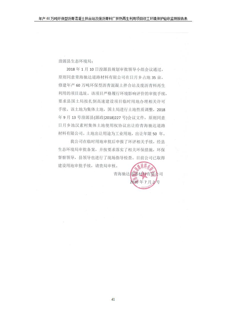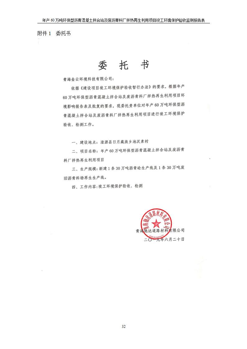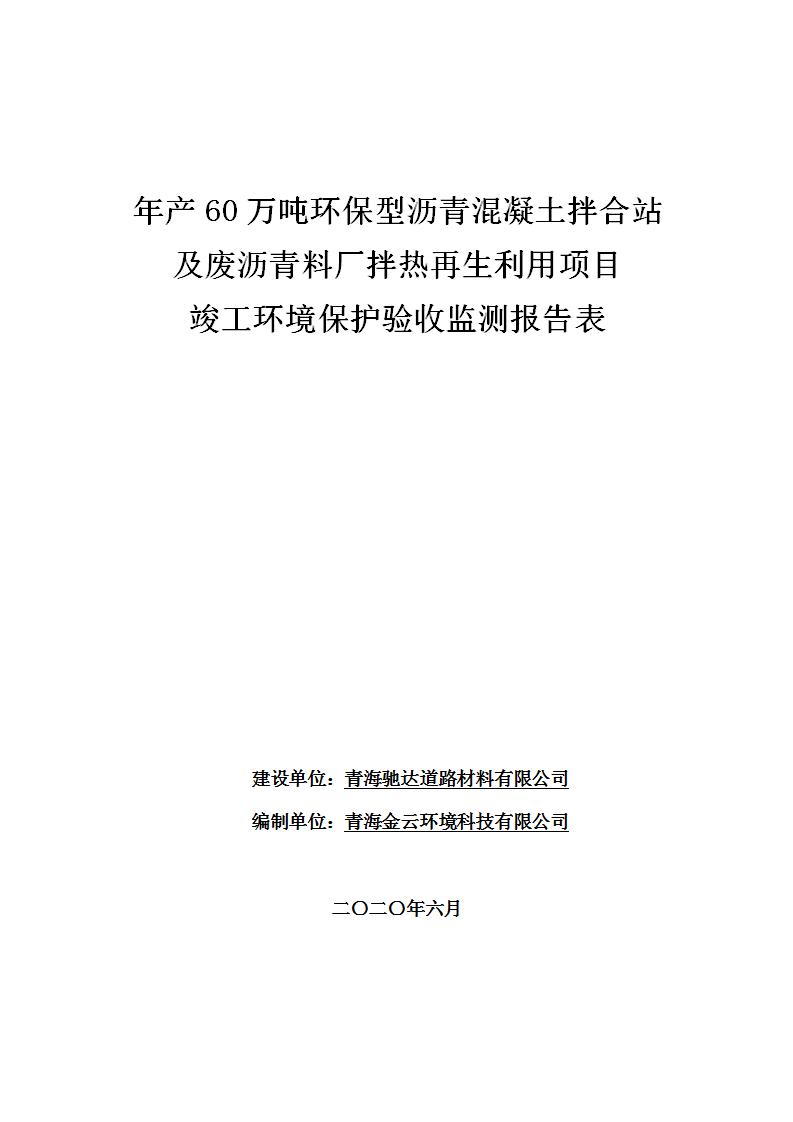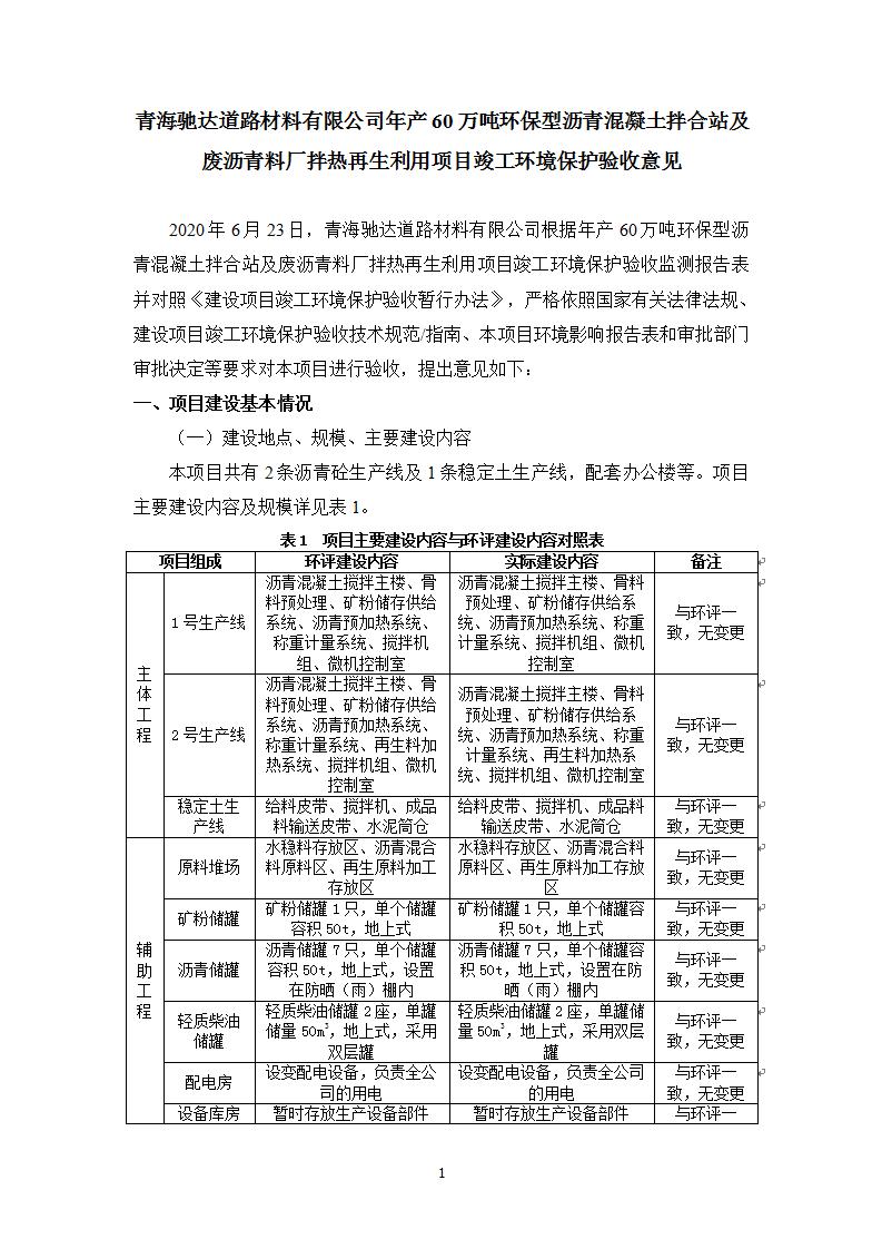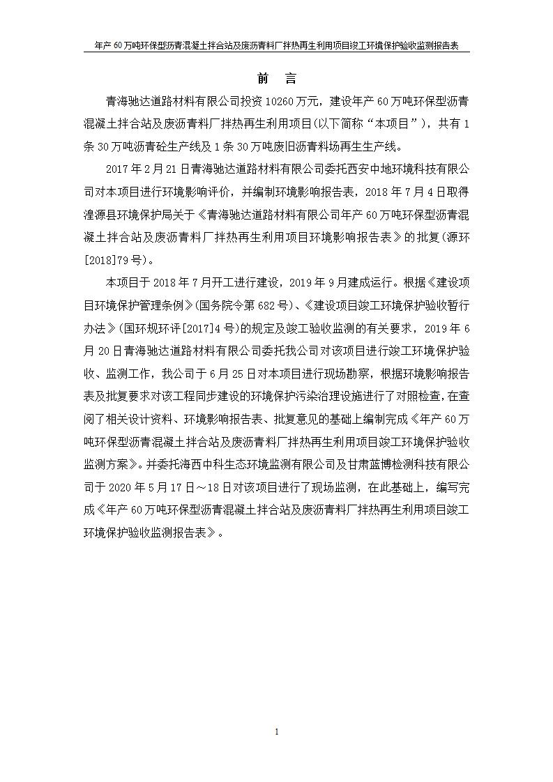 根據(jù)中華人民共和國國務(wù)院令第682號《國務(wù)院關(guān)于修改〈建設(shè)項目環(huán)境保護(hù)管理條例〉的決定》和《建設(shè)項目竣工環(huán)境保護(hù)驗收暫行辦法》(國務(wù)院令682號),青海馳達(dá)道路材料有限公司年產(chǎn)60萬噸環(huán)保型瀝青混凝土拌合站及廢瀝青料廠拌熱再生利用項目竣工環(huán)境保護(hù)驗收監(jiān)測報告表公示如下。 一、項目名稱:年產(chǎn)60萬噸環(huán)保型瀝青混凝土拌合站及廢瀝青料廠拌熱再生利用項目竣工環(huán)境保護(hù)驗收監(jiān)測報告表 二、地點(diǎn):湟源縣日月藏族鄉(xiāng)池漢素村 三、建設(shè)單位:青海馳達(dá)道路材料有限公司 四、建設(shè)內(nèi)容:本項目共有2條瀝青砼生產(chǎn)線及1條穩(wěn)定土生產(chǎn)線,配套辦公樓等。 五、聯(lián)系人:楊工 六、聯(lián)系電 話:0971-6515411 七、公示時間:二〇二〇年七月六日至二〇二〇年七月三十一日 公示期間,對上述公示內(nèi)容如有異議,請以書面形式反饋,個人須署真實姓名,單位須加蓋公章。