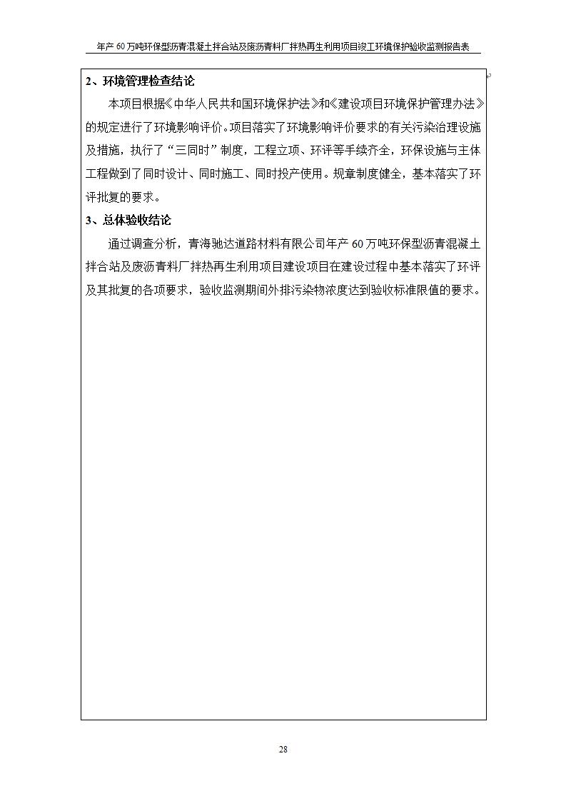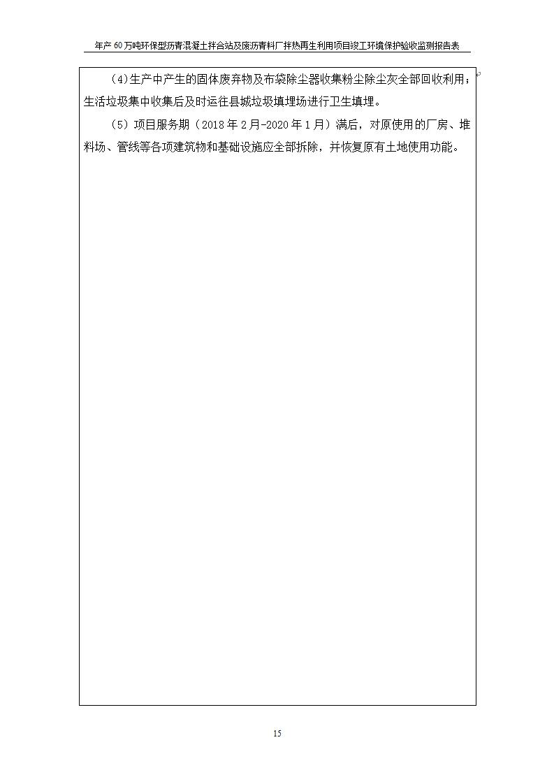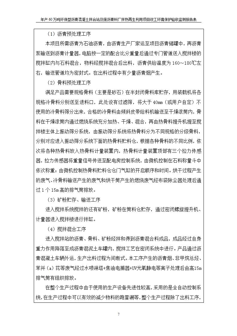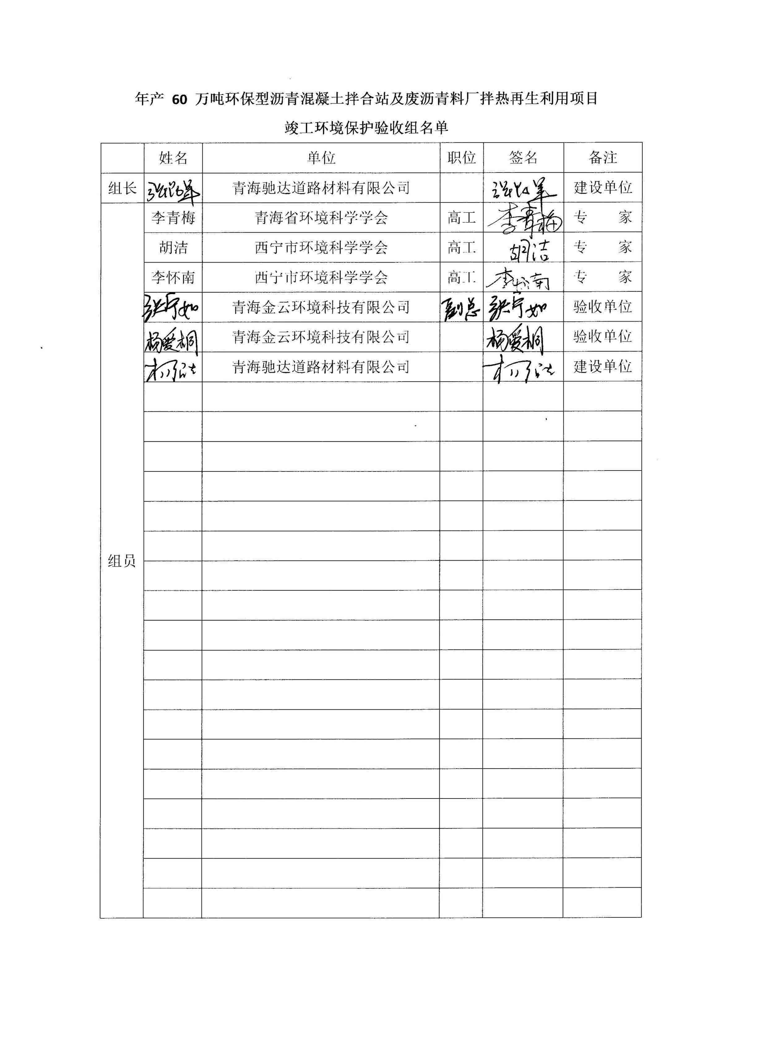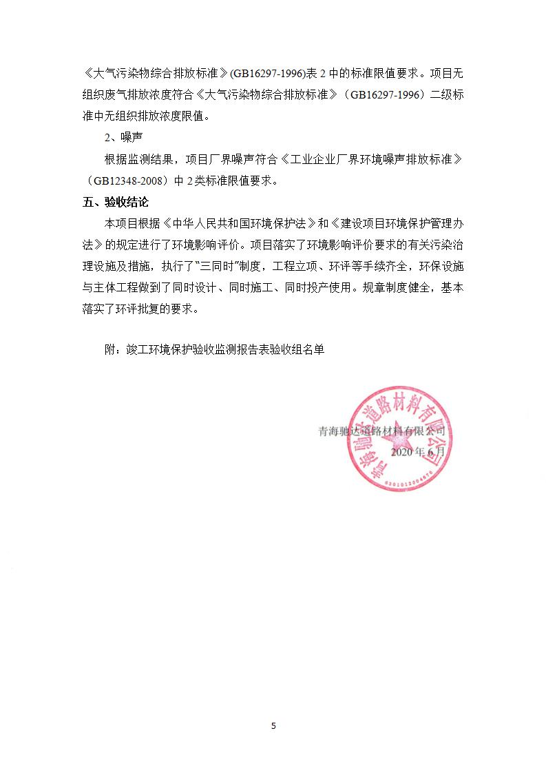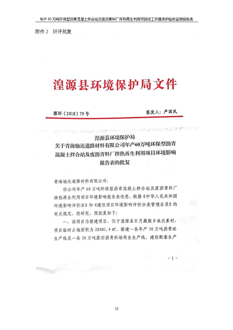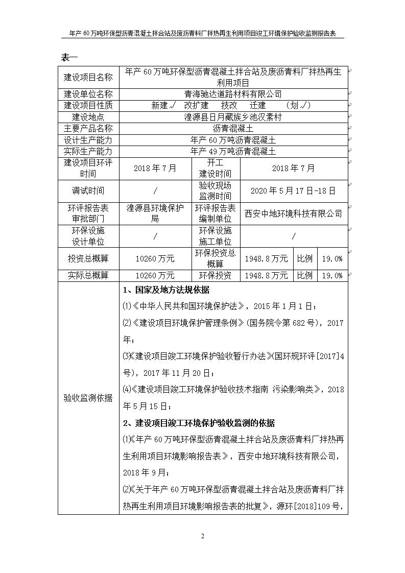 根據(jù)中華人民共和國國務(wù)院令第682號《國務(wù)院關(guān)于修改〈建設(shè)項目環(huán)境保護(hù)管理條例〉的決定》和《建設(shè)項目竣工環(huán)境保護(hù)驗收暫行辦法》(國務(wù)院令682號),青海馳達(dá)道路材料有限公司年產(chǎn)60萬噸環(huán)保型瀝青混凝土拌合站及廢瀝青料廠拌熱再生利用項目竣工環(huán)境保護(hù)驗收監(jiān)測報告表公示如下。 一、項目名稱:年產(chǎn)60萬噸環(huán)保型瀝青混凝土拌合站及廢瀝青料廠拌熱再生利用項目竣工環(huán)境保護(hù)驗收監(jiān)測報告表 二、地點(diǎn):湟源縣日月藏族鄉(xiāng)池漢素村 三、建設(shè)單位:青海馳達(dá)道路材料有限公司 四、建設(shè)內(nèi)容:本項目共有2條瀝青砼生產(chǎn)線及1條穩(wěn)定土生產(chǎn)線,配套辦公樓等。 五、聯(lián)系人:楊工 六、聯(lián)系電 話:0971-6515411 七、公示時間:二〇二〇年七月六日至二〇二〇年七月三十一日 公示期間,對上述公示內(nèi)容如有異議,請以書面形式反饋,個人須署真實姓名,單位須加蓋公章。