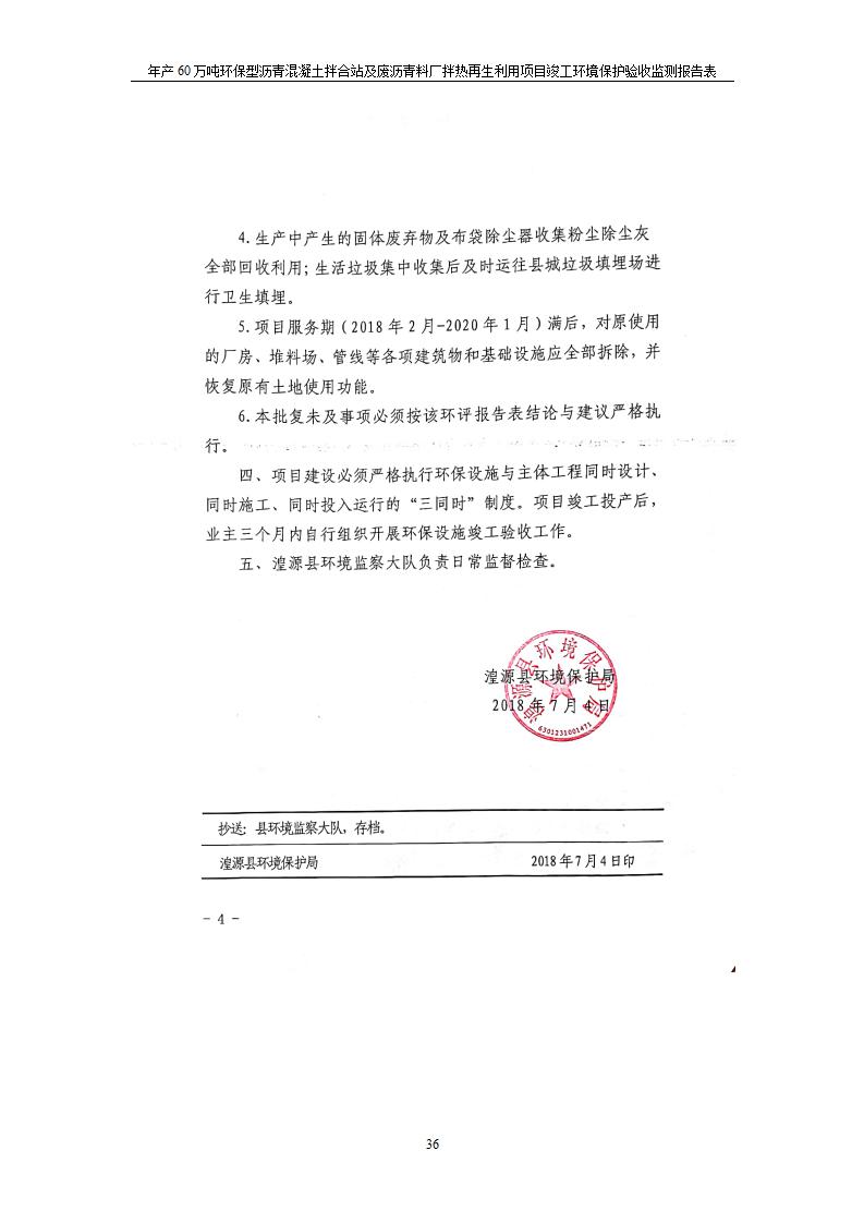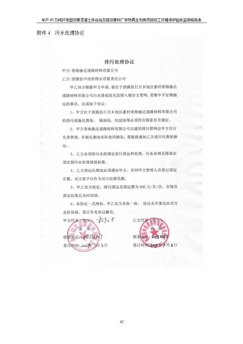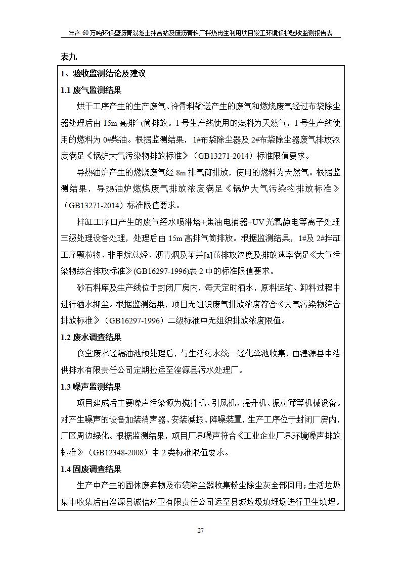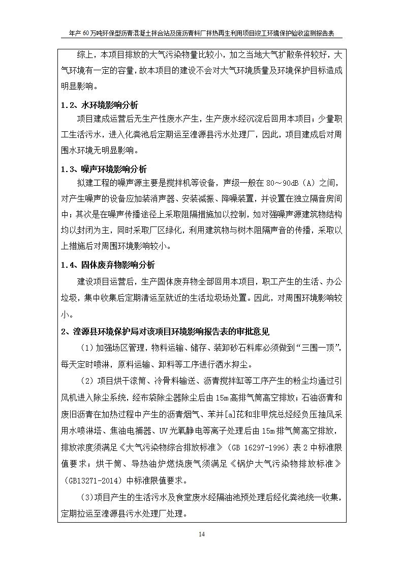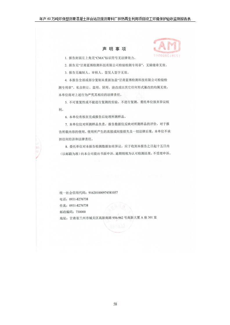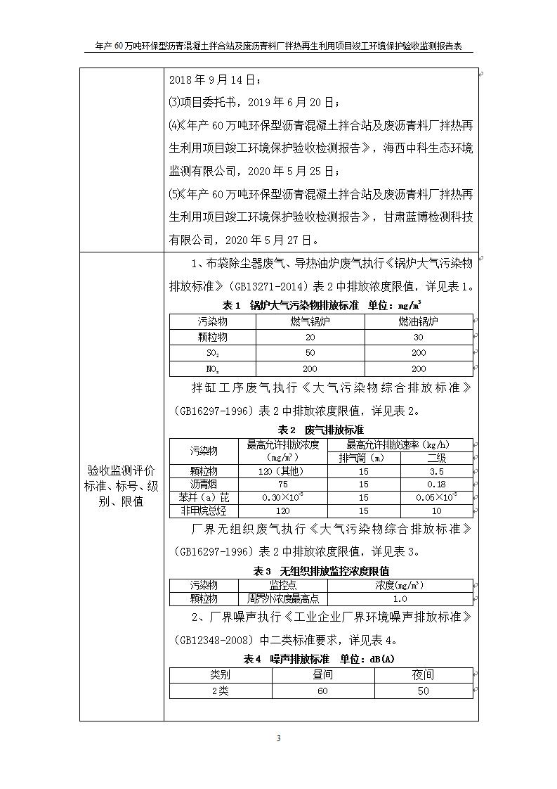 根據(jù)中華人民共和國國務(wù)院令第682號《國務(wù)院關(guān)于修改〈建設(shè)項目環(huán)境保護(hù)管理條例〉的決定》和《建設(shè)項目竣工環(huán)境保護(hù)驗收暫行辦法》(國務(wù)院令682號),青海馳達(dá)道路材料有限公司年產(chǎn)60萬噸環(huán)保型瀝青混凝土拌合站及廢瀝青料廠拌熱再生利用項目竣工環(huán)境保護(hù)驗收監(jiān)測報告表公示如下。 一、項目名稱:年產(chǎn)60萬噸環(huán)保型瀝青混凝土拌合站及廢瀝青料廠拌熱再生利用項目竣工環(huán)境保護(hù)驗收監(jiān)測報告表 二、地點(diǎn):湟源縣日月藏族鄉(xiāng)池漢素村 三、建設(shè)單位:青海馳達(dá)道路材料有限公司 四、建設(shè)內(nèi)容:本項目共有2條瀝青砼生產(chǎn)線及1條穩(wěn)定土生產(chǎn)線,配套辦公樓等。 五、聯(lián)系人:楊工 六、聯(lián)系電 話:0971-6515411 七、公示時間:二〇二〇年七月六日至二〇二〇年七月三十一日 公示期間,對上述公示內(nèi)容如有異議,請以書面形式反饋,個人須署真實姓名,單位須加蓋公章。